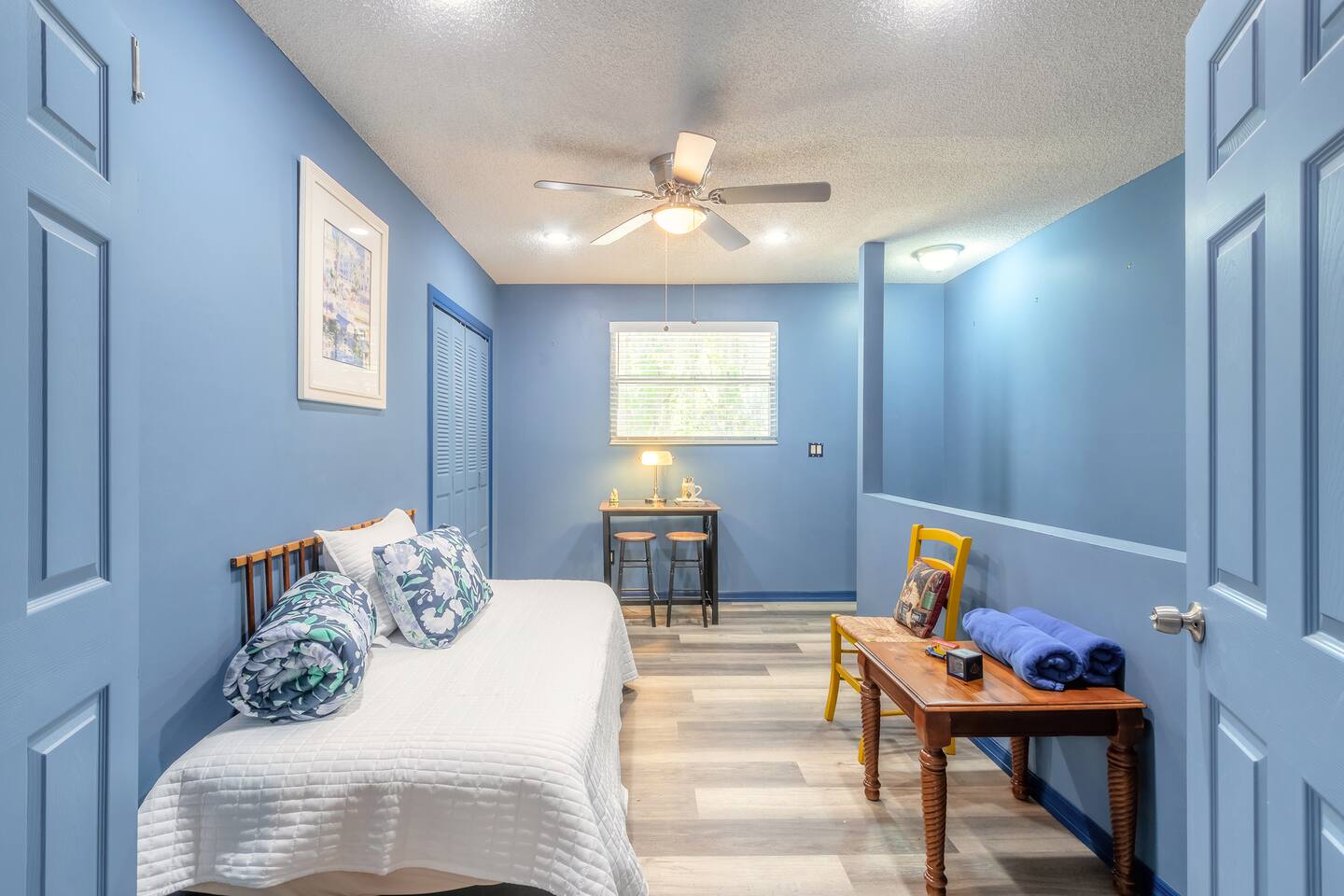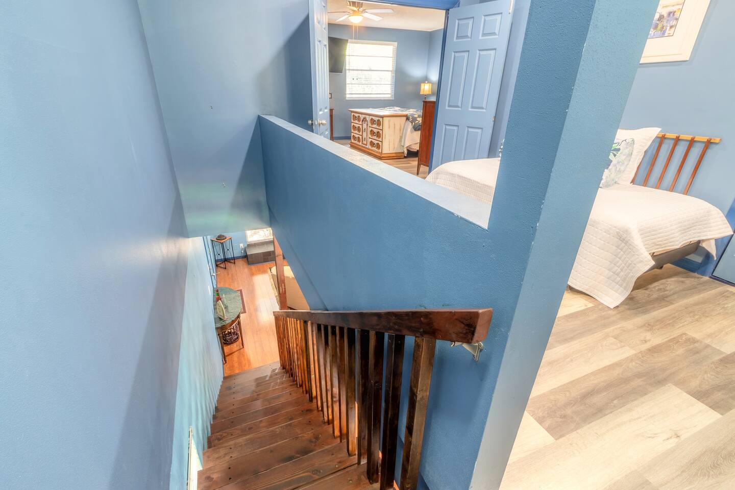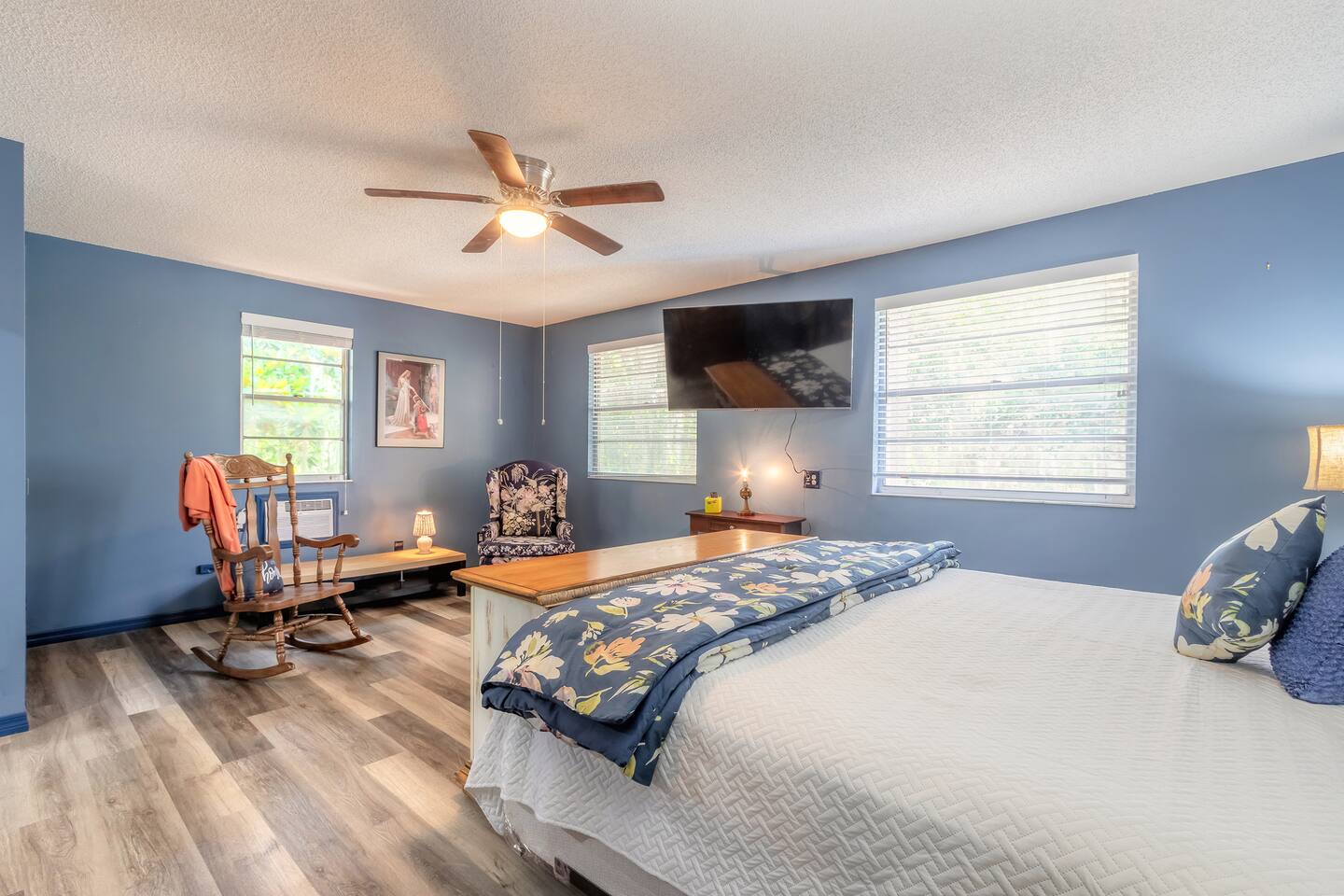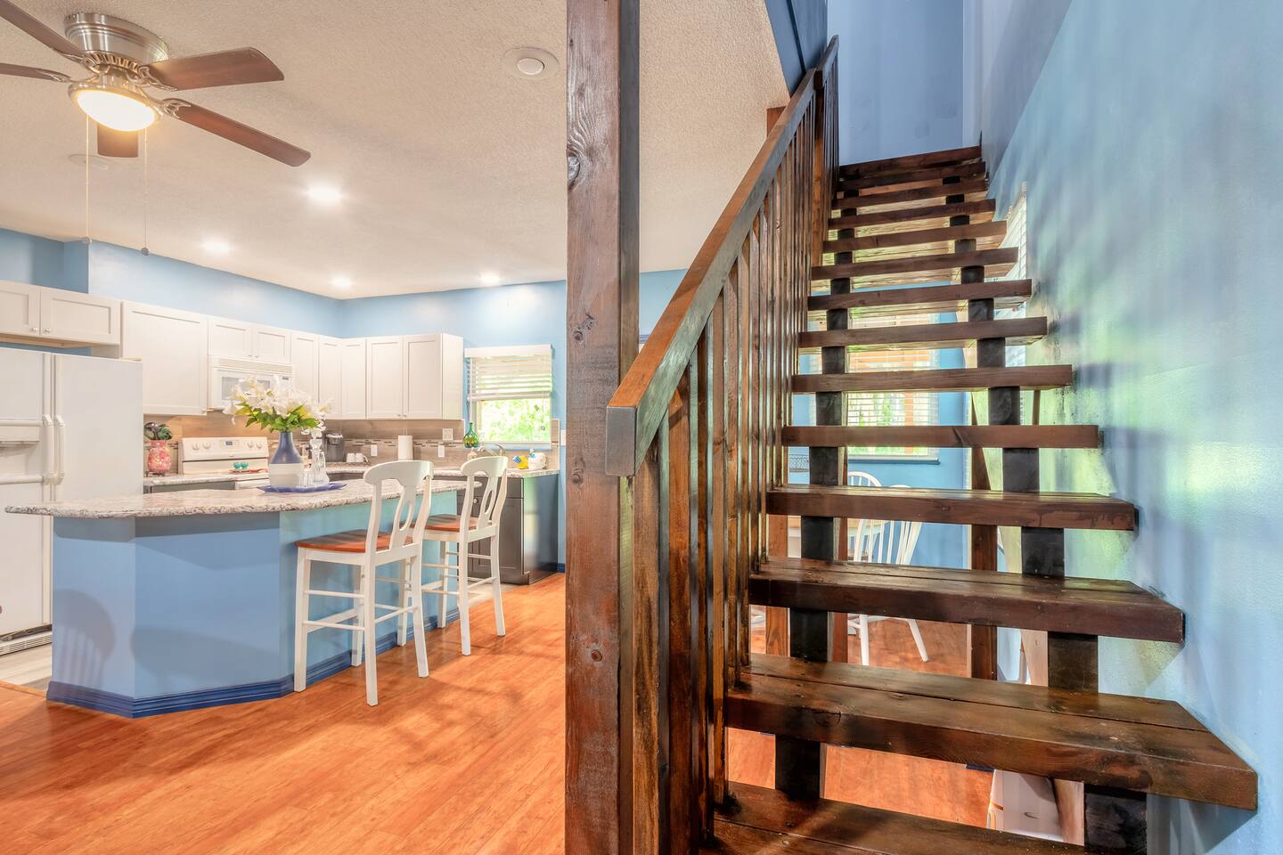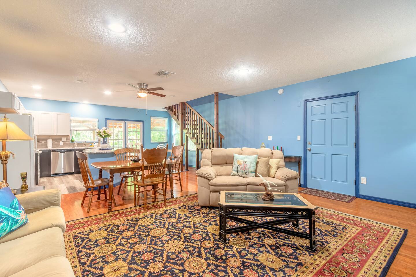 Forget your worries in this spacious and serene space only 3.9 Miles to beach, 1.2 Miles to AdventHealth and close to everything else in New Smyrna Beach and Edgewater. Plus, you will have access to a big pool and hot tub directly across the small road! The home sleeps five with a king bed in the main bedroom, a day-bed in the landing and a queen sleeper sofa in the living room. The ensuite bathroom and laundry room are located upstairs and are accessed thru the main bedroom.