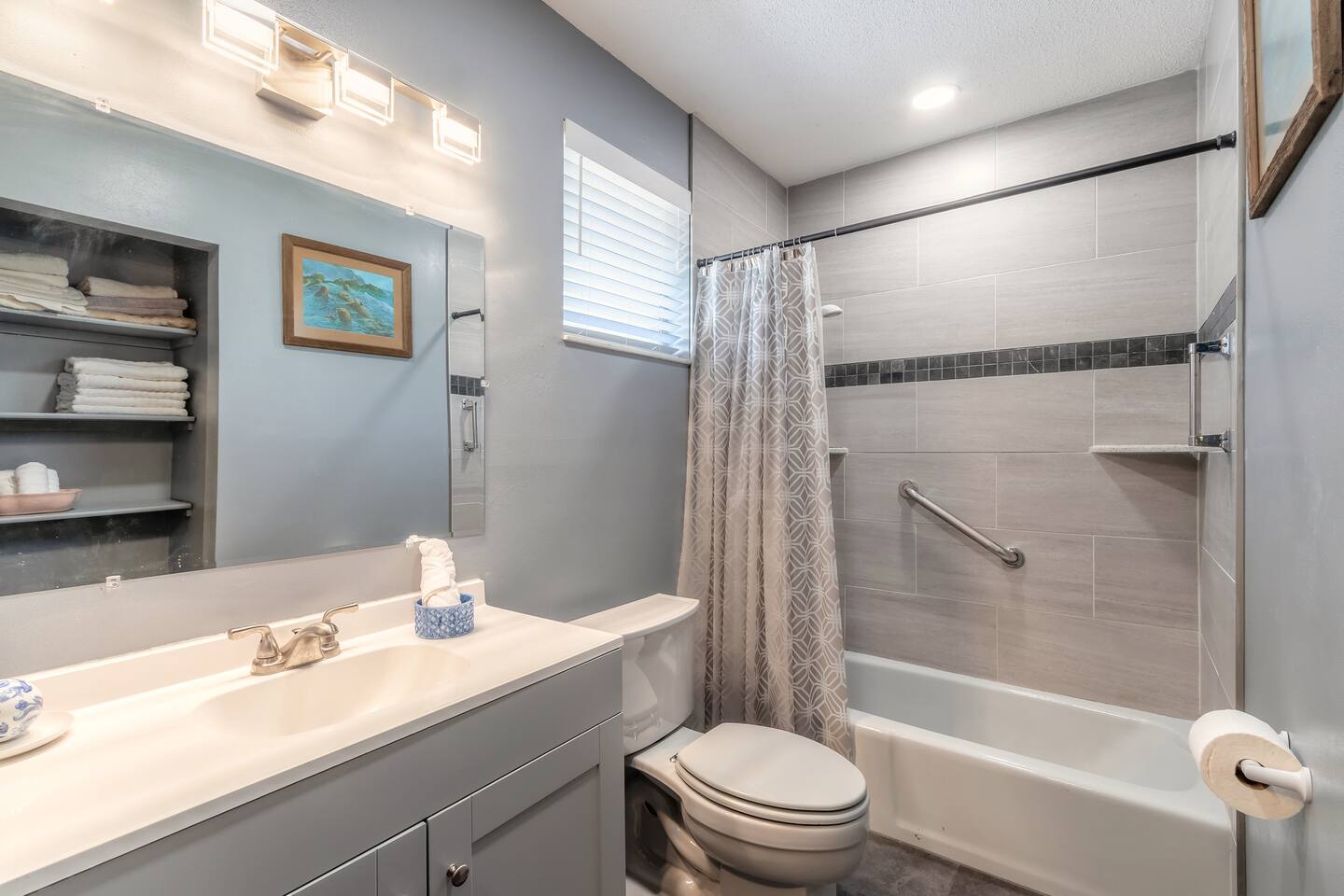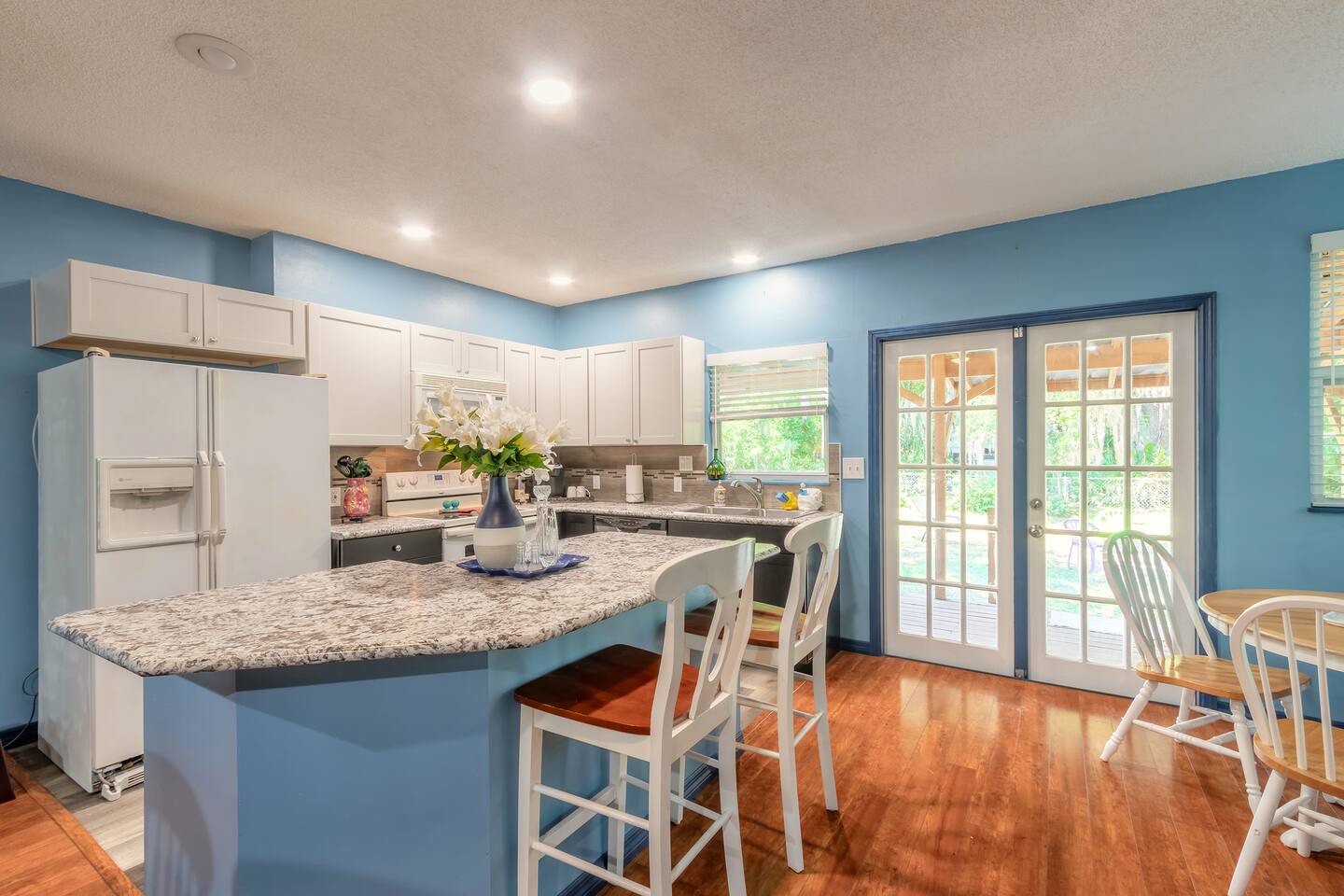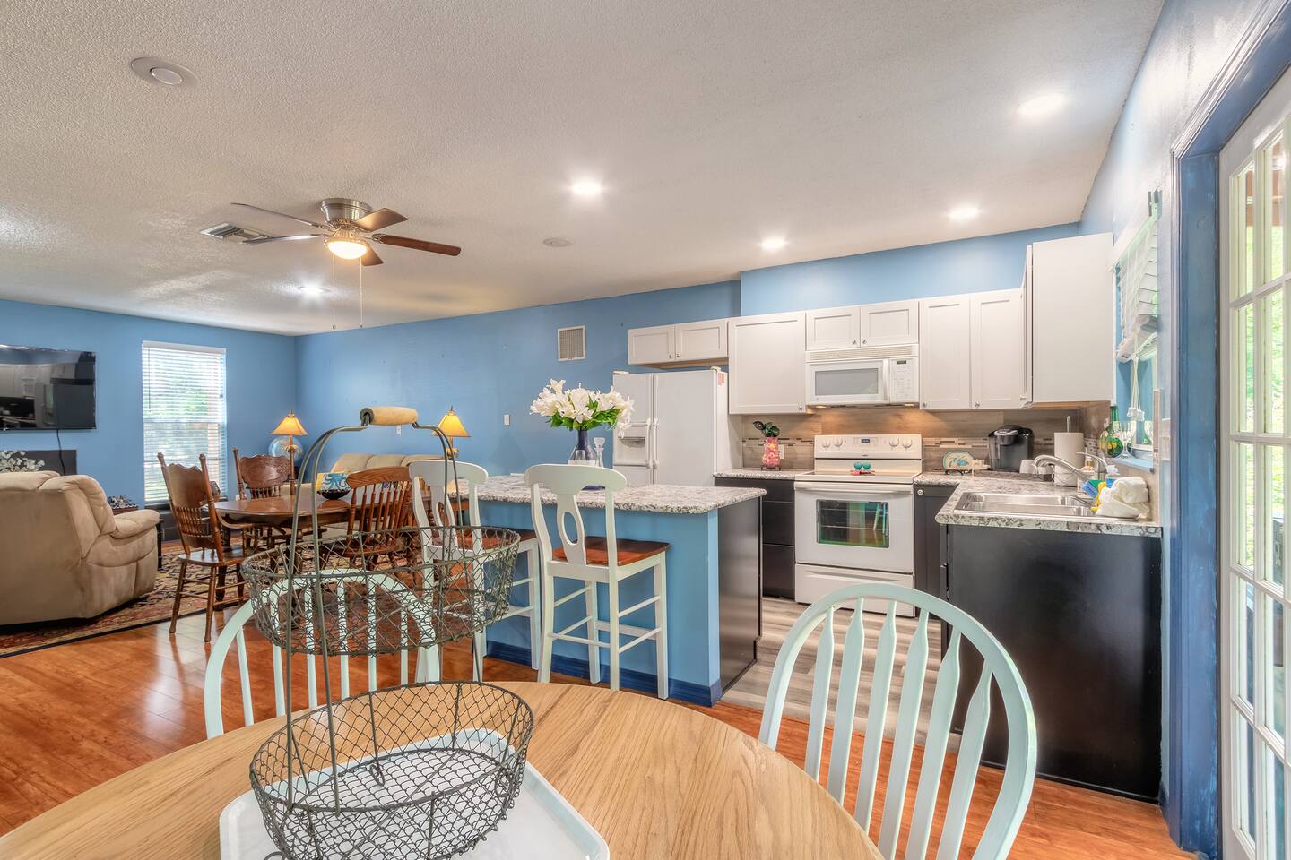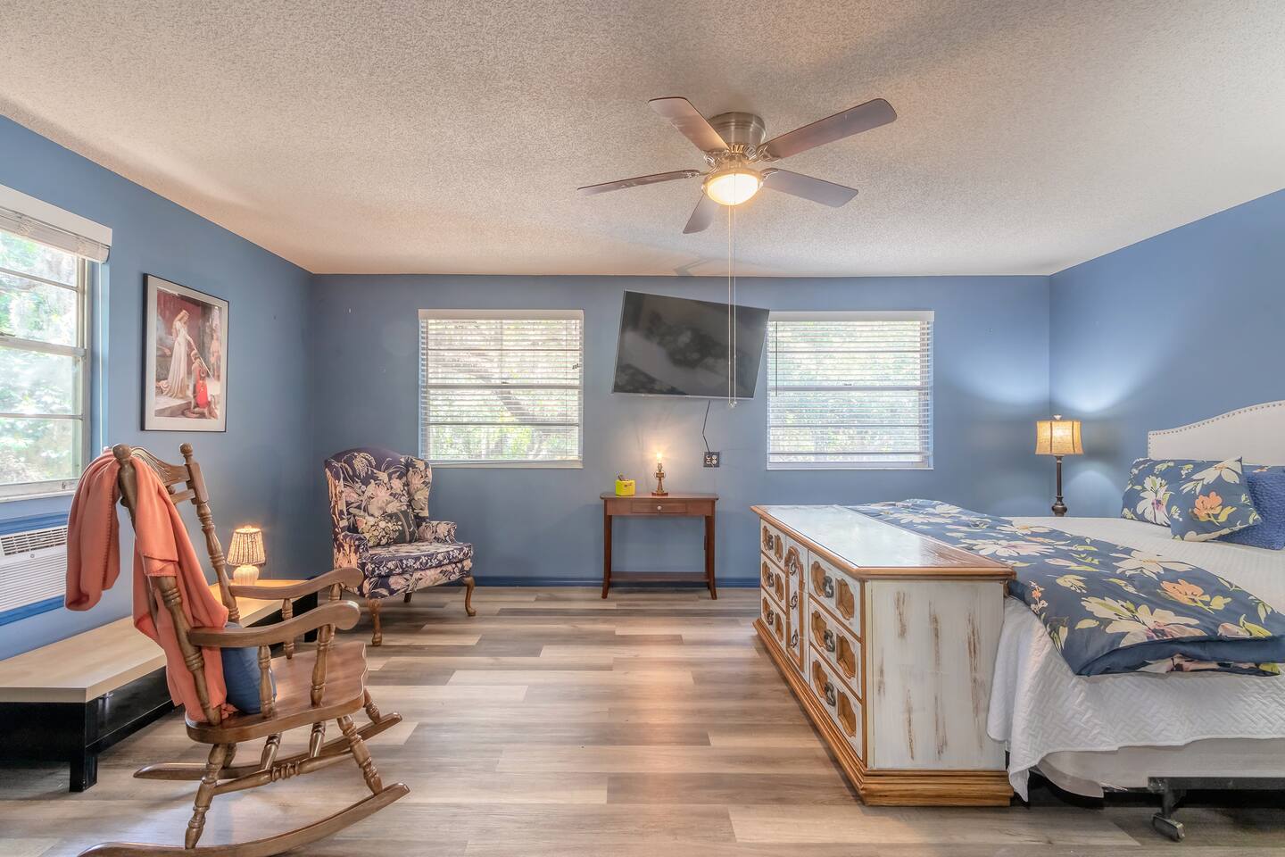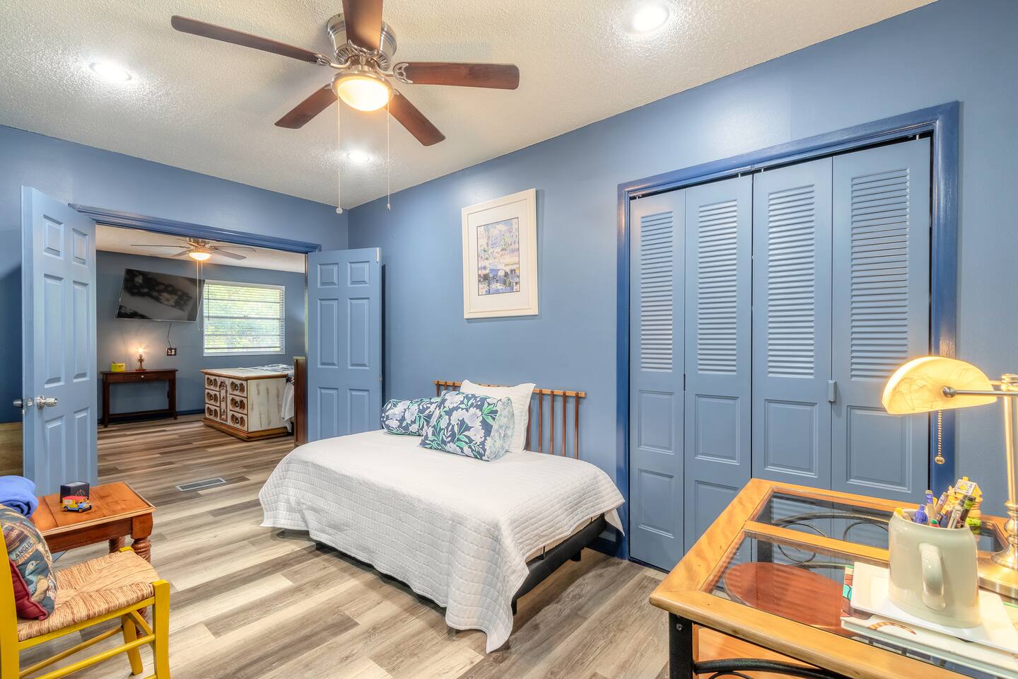 Forget your worries in this spacious and serene space only 3.9 Miles to beach, 1.2 Miles to AdventHealth and close to everything else in New Smyrna Beach and Edgewater. Plus, you will have access to a big pool and hot tub directly across the small road! The home sleeps five with a king bed in the main bedroom, a day-bed in the landing and a queen sleeper sofa in the living room. The ensuite bathroom and laundry room are located upstairs and are accessed thru the main bedroom.
