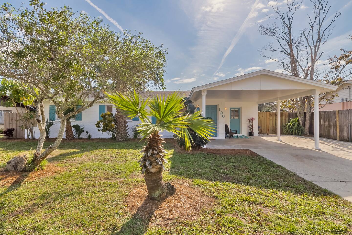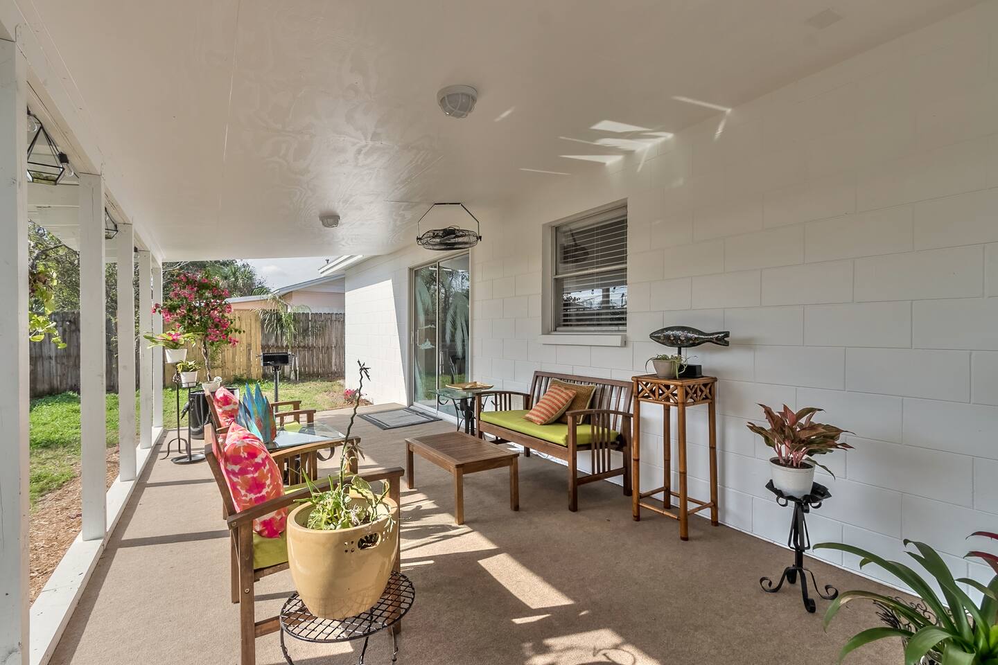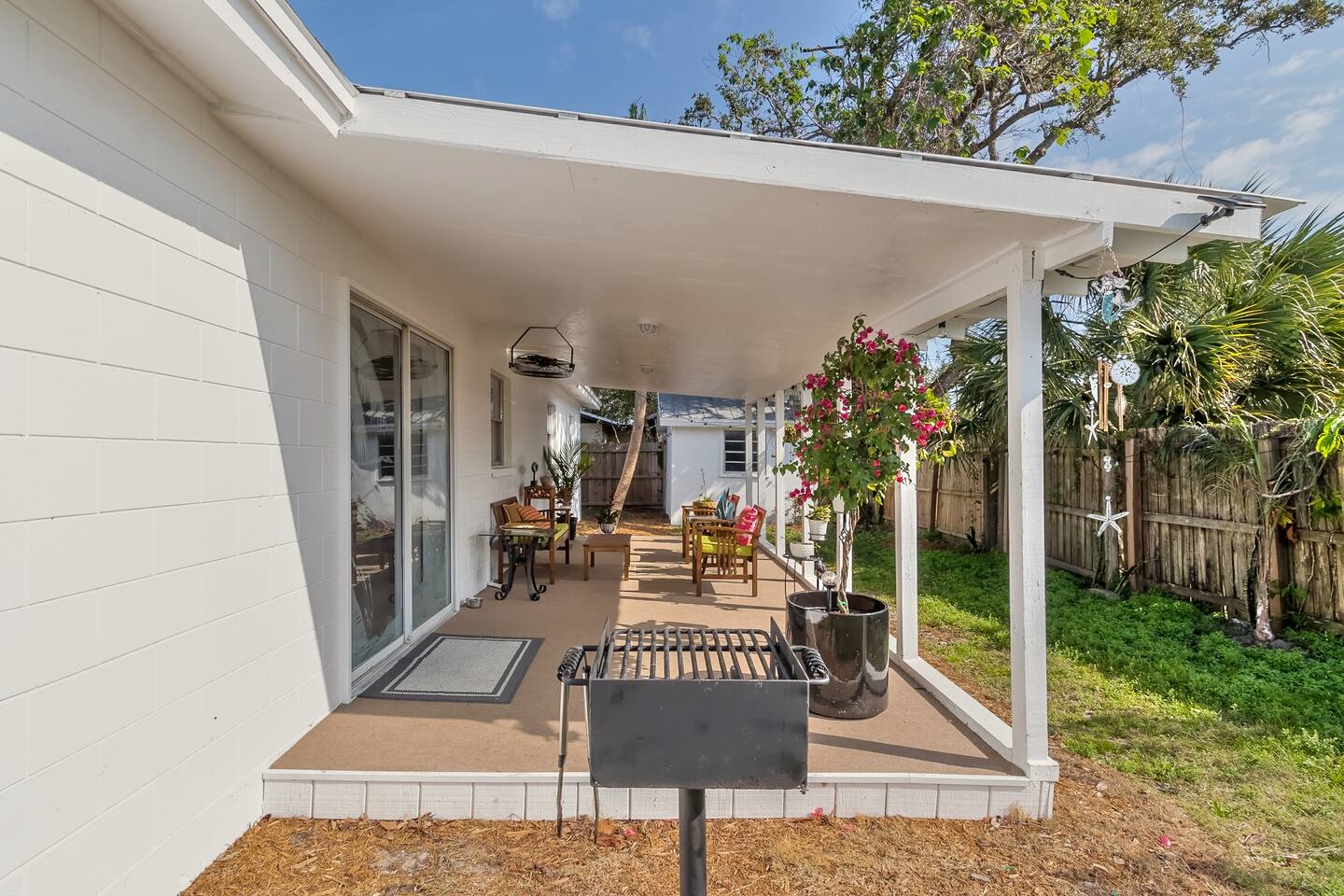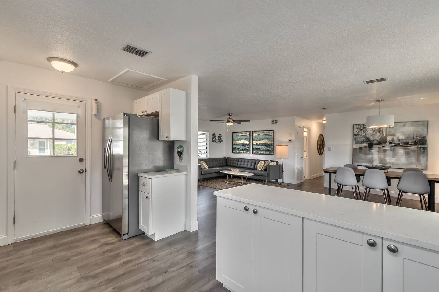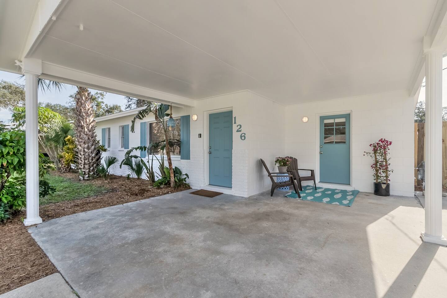 On this quiet street, your vacation home is 2 bed and 2 bath and completely remodeled. Everything is new, with the exception of some local antiques and original art. Our favorite attribute of this home is the true open concept in the common areas. The kitchen, dining room and living room are extremely spacious and connected without walls. Enjoy the 75" 4k TV while conversing with family in the kitchen and bar. Both the ensuite and guest baths are completely new with gray and white tile, plenty of light and high mounted shower heads. The guest bath also has a tub. The main bedroom features a new king size Green Tea mattress, 55" Roku TV and plenty of closet space. The guest/kid's room has full size bunk beds and a futon, a closet with games and books as well as its own 55" Roku TV. Outside, the back yard is fully fenced in for your pup to enjoy. There is a covered patio with furniture as well as a park style BBQ grill. The back yard is illuminated at night by five solar string lights. Parking is ample. There is room to park a small to medium size boat (up to 21ft), or a kayak, motorcycle or other trailer while still having parking for two cars. You will be close to grocery stores (Publix, Winn Dixie and Aldi), more restaurants than we can list here, not to mention banks, stores, etc. And, did we mention the drive-on beaches, canal district, dog beaches, dog parks, boat and kayak launches, public piers (within walking distance), Cape Canaveral, Kennedy Space Center, Daytona Beach, world renowned Mosquito Lagoon for fishing, one hour drive to Orlando, hour and a half to St Augustine, Manatee viewing at Merrit Island National Wildlife Refuge. Oh! And you can watch the space launches from the house! We can't list all of the amazing things to do and see here in this slice of Florida Coast Heaven.