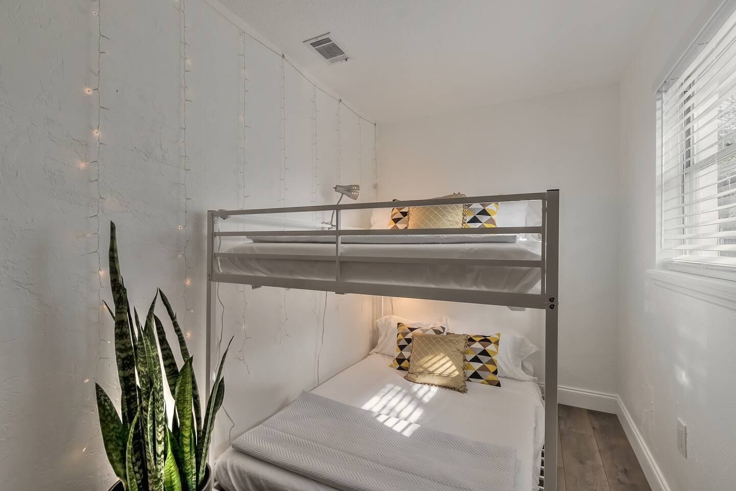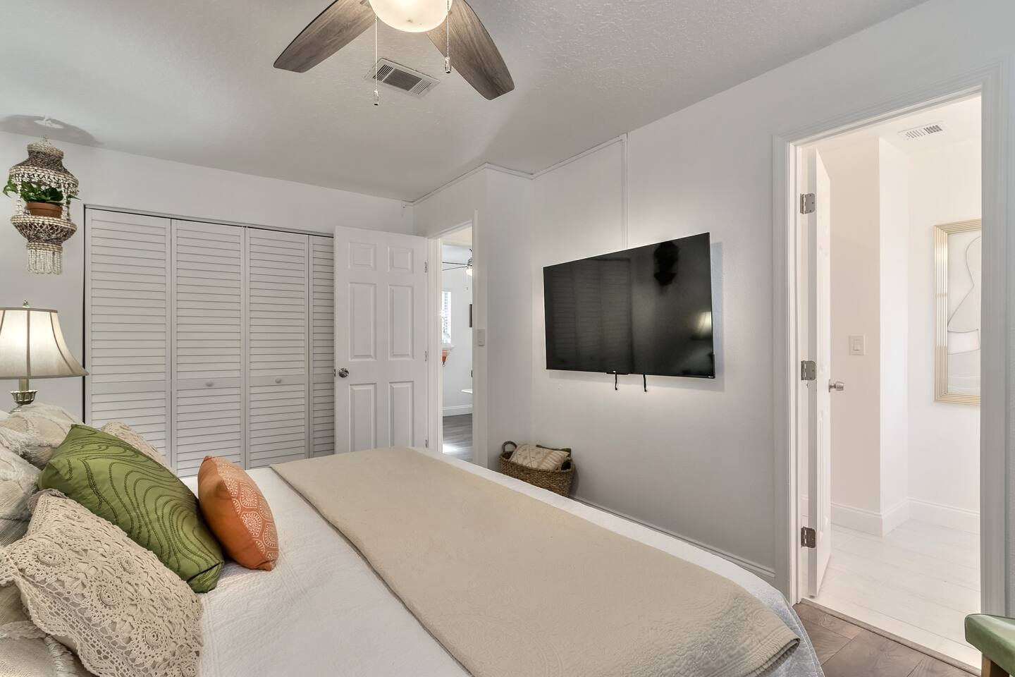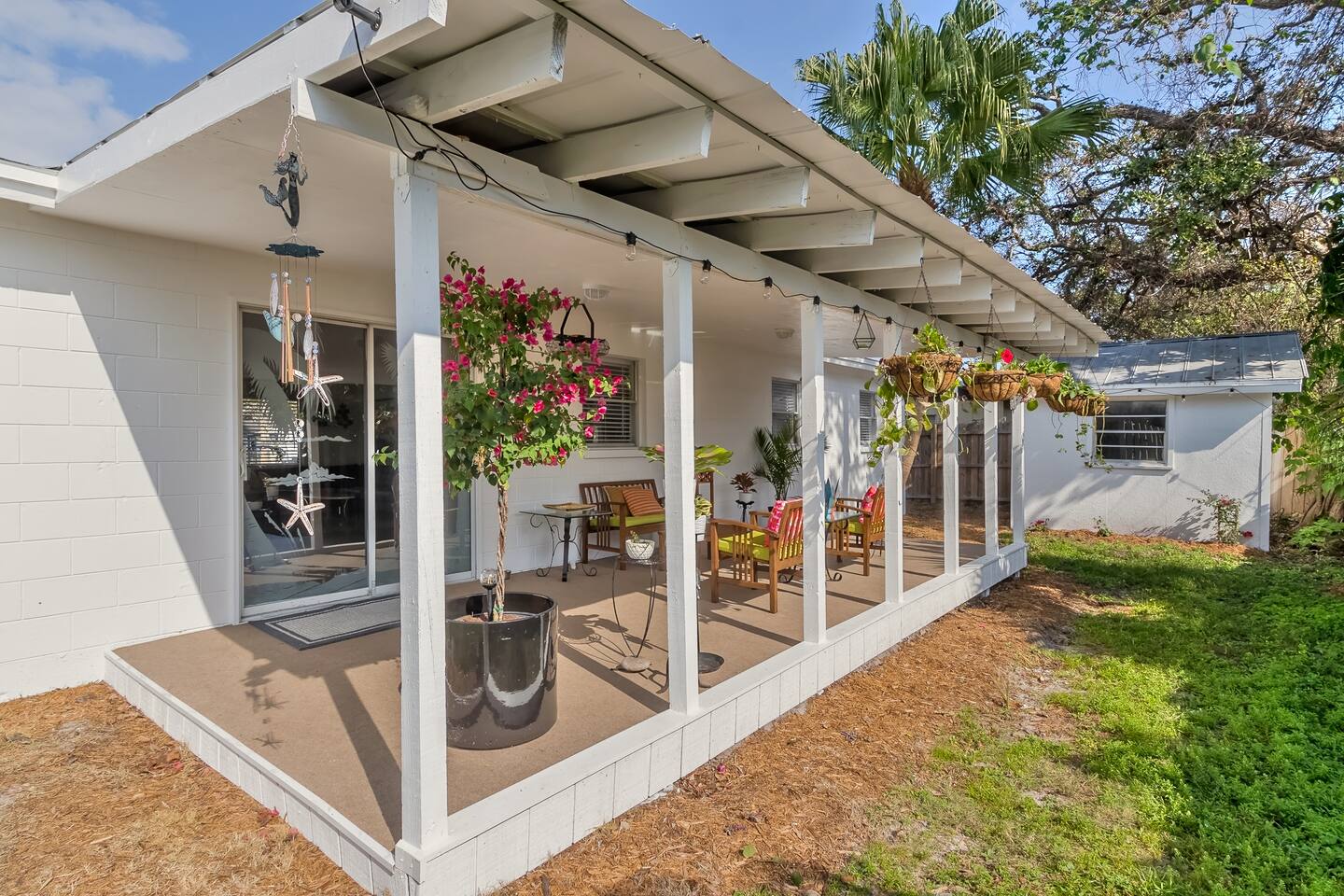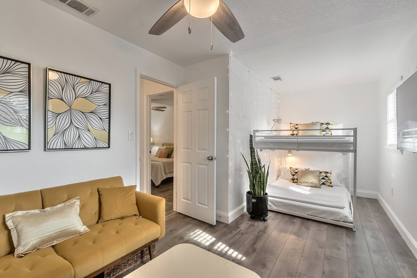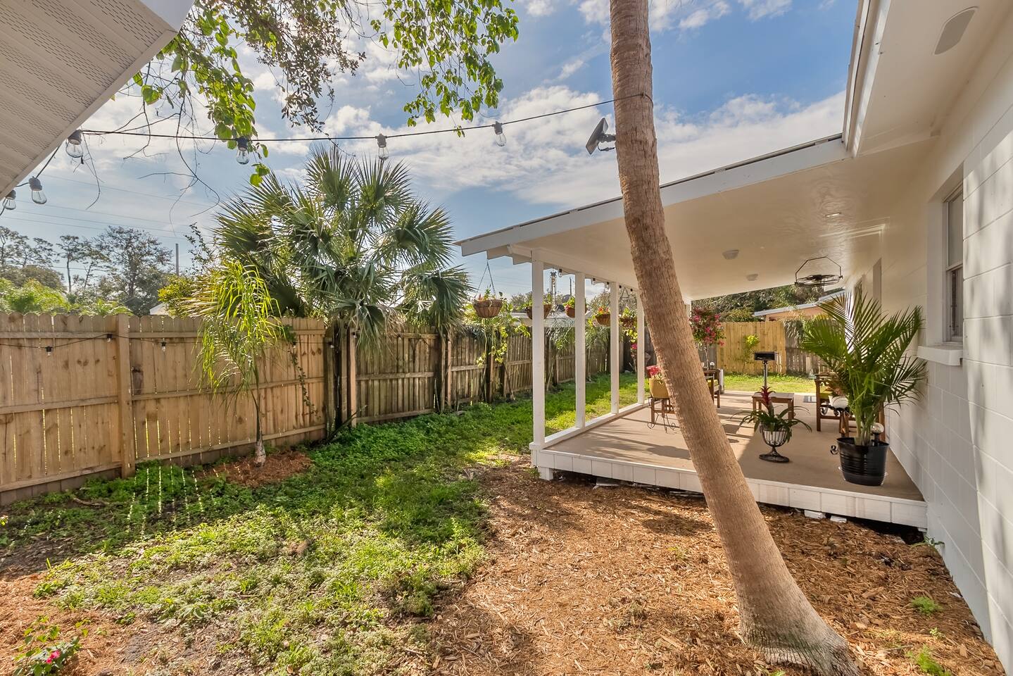 On this quiet street, your vacation home is 2 bed and 2 bath and completely remodeled. Everything is new, with the exception of some local antiques and original art. Our favorite attribute of this home is the true open concept in the common areas. The kitchen, dining room and living room are extremely spacious and connected without walls. Enjoy the 75" 4k TV while conversing with family in the kitchen and bar. Both the ensuite and guest baths are completely new with gray and white tile, plenty of light and high mounted shower heads. The guest bath also has a tub. The main bedroom features a new king size Green Tea mattress, 55" Roku TV and plenty of closet space. The guest/kid's room has full size bunk beds and a futon, a closet with games and books as well as its own 55" Roku TV. Outside, the back yard is fully fenced in for your pup to enjoy. There is a covered patio with furniture as well as a park style BBQ grill. The back yard is illuminated at night by five solar string lights. Parking is ample. There is room to park a small to medium size boat (up to 21ft), or a kayak, motorcycle or other trailer while still having parking for two cars. You will be close to grocery stores (Publix, Winn Dixie and Aldi), more restaurants than we can list here, not to mention banks, stores, etc. And, did we mention the drive-on beaches, canal district, dog beaches, dog parks, boat and kayak launches, public piers (within walking distance), Cape Canaveral, Kennedy Space Center, Daytona Beach, world renowned Mosquito Lagoon for fishing, one hour drive to Orlando, hour and a half to St Augustine, Manatee viewing at Merrit Island National Wildlife Refuge. Oh! And you can watch the space launches from the house! We can't list all of the amazing things to do and see here in this slice of Florida Coast Heaven.