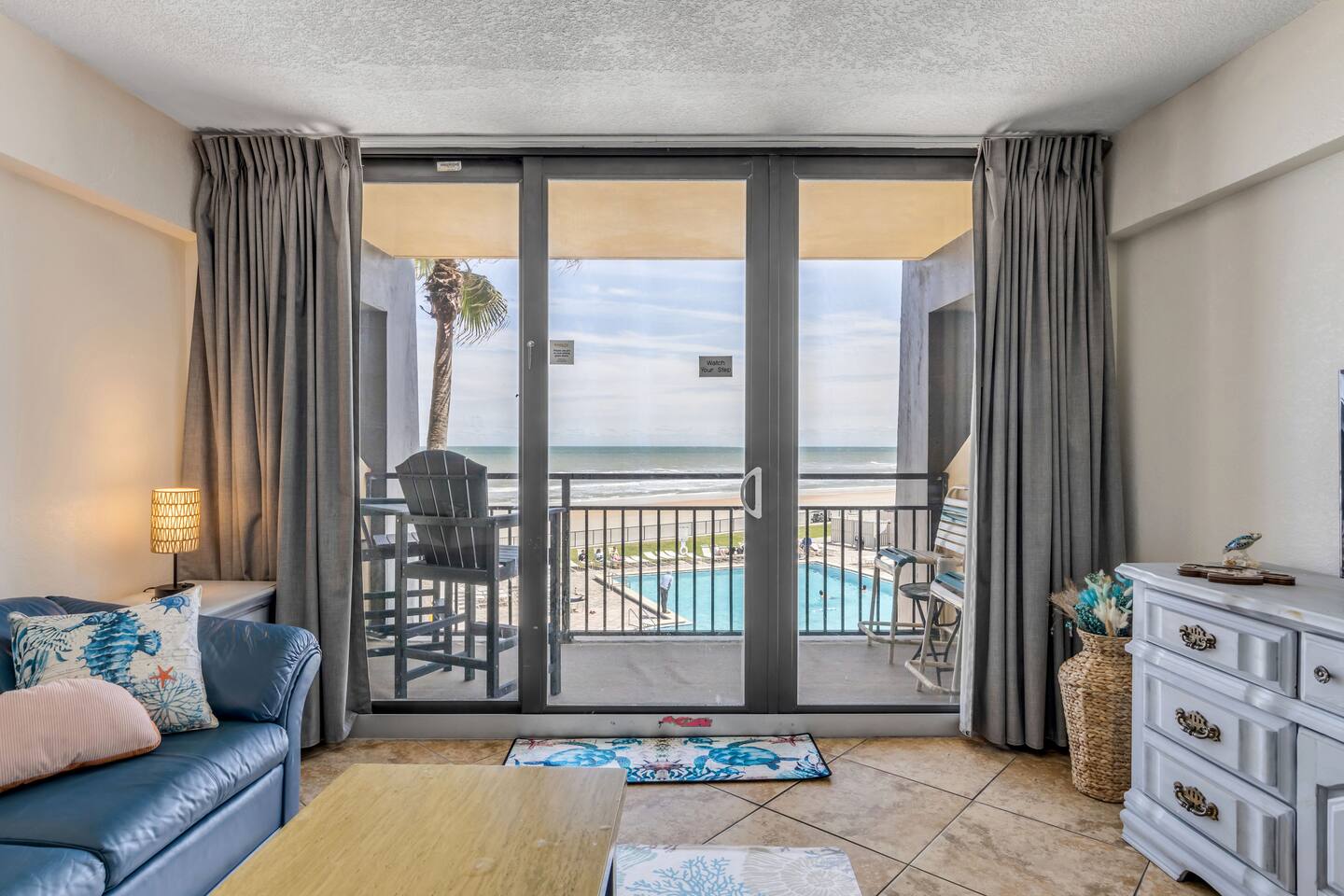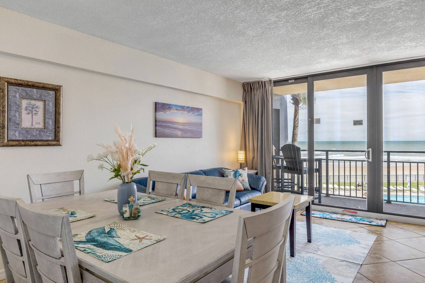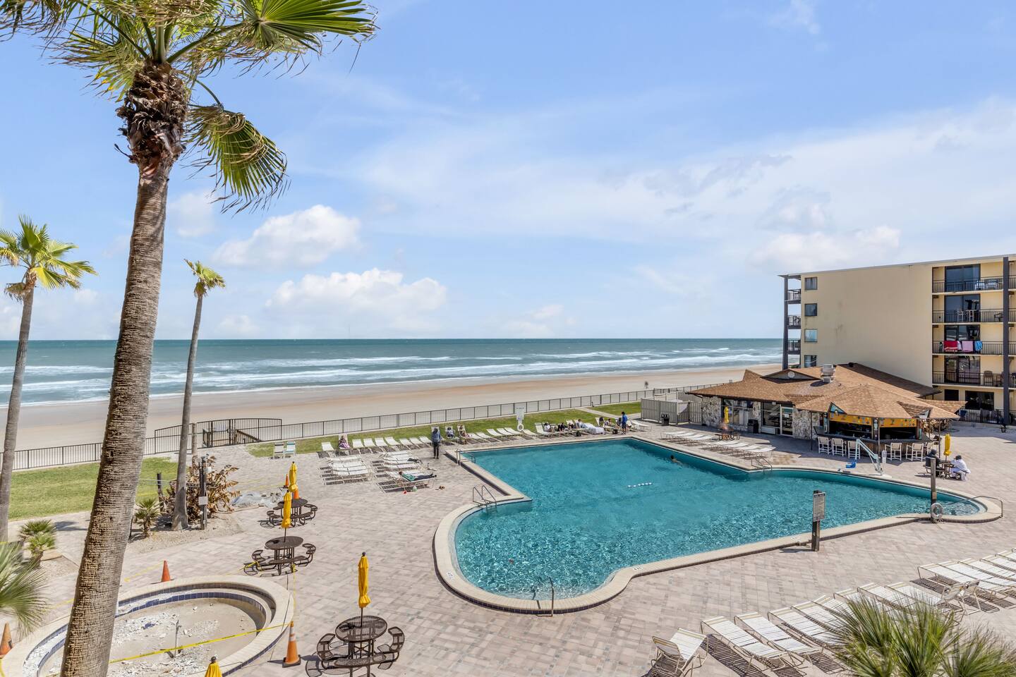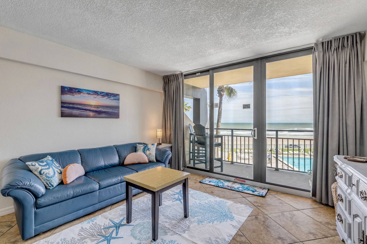 This 1BR/1BA oceanfront condo sleeps 4 and offers direct beach access. Enjoy a resort-style pool, indoor heated pool, and on-site tiki bar. Relax with coastal vibes, comfy living, and everything you need for the perfect beach getaway—sun, sand, and endless ocean views!