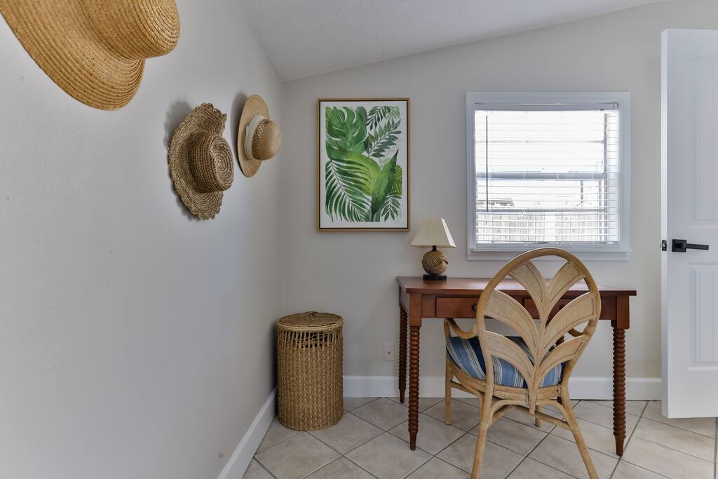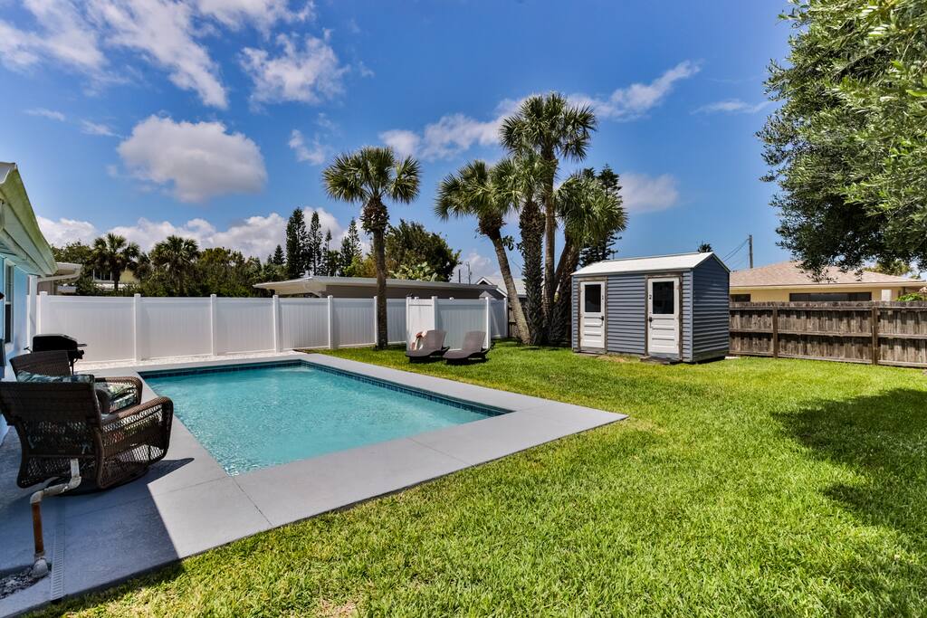 Welcome to this charming 2-bedroom, 1-bathroom pool home in the heart of New Smyrna Beach. As part of a duplex, this coastal-cottage-inspired retreat offers a bright and inviting atmosphere. The spacious master bedroom features a king-sized bed, a desk, and a flat-screen TV. The second bedroom includes two single beds, ideal for guests or family members. The kitchen is fully equipped to meet all your cooking needs. Enjoy high-speed internet access and a backyard oasis with a heated pool.