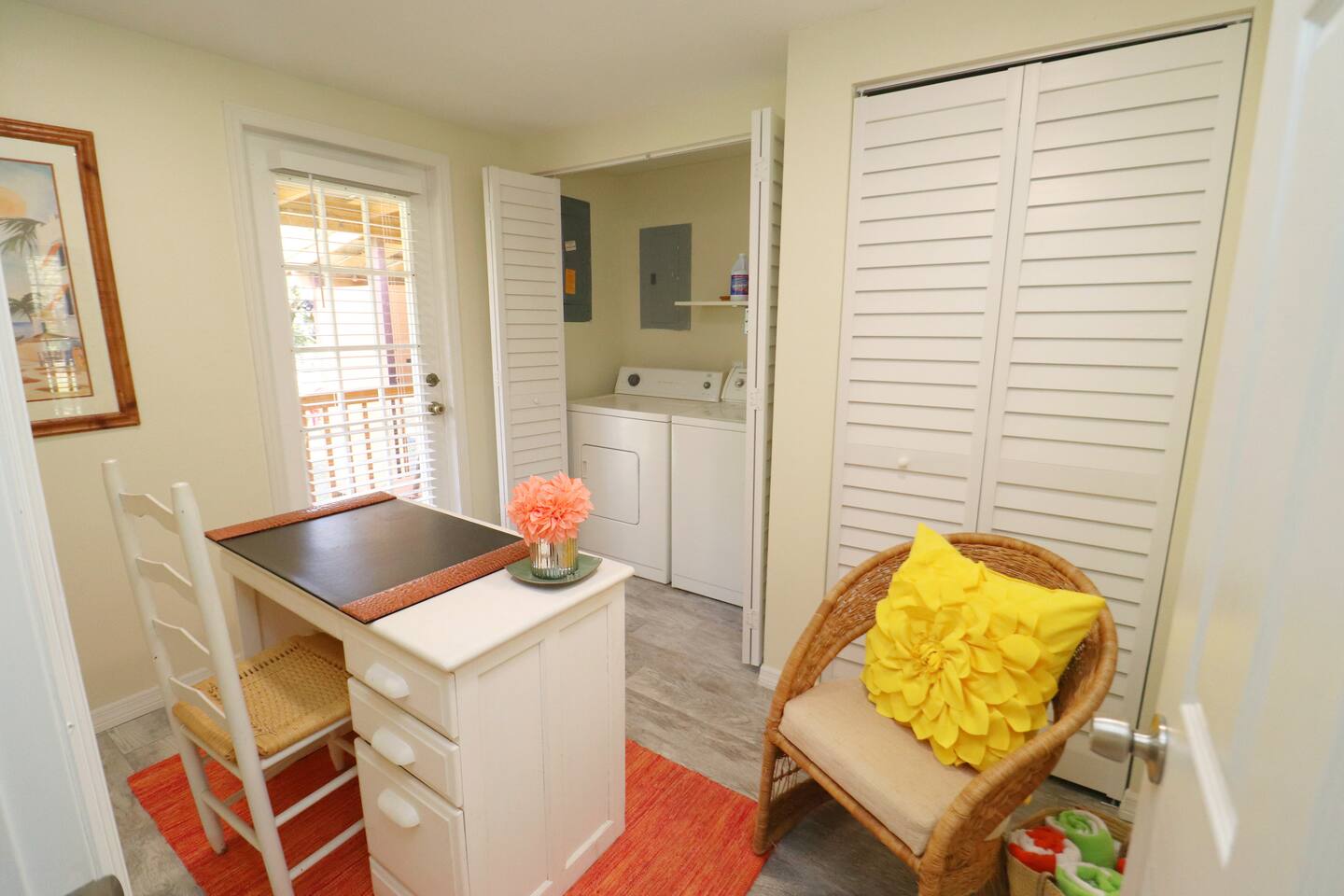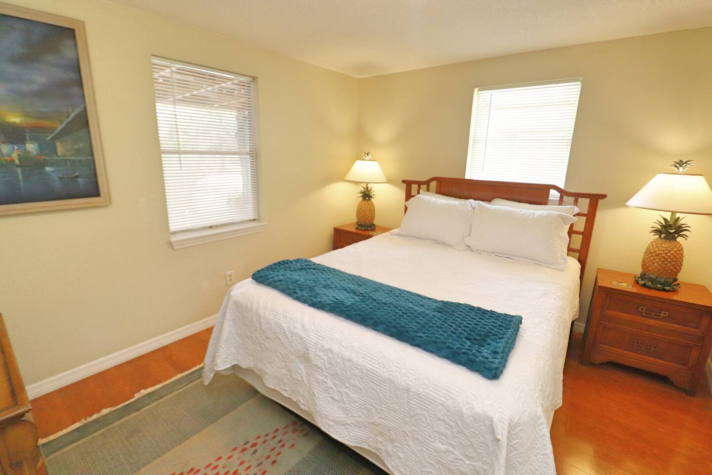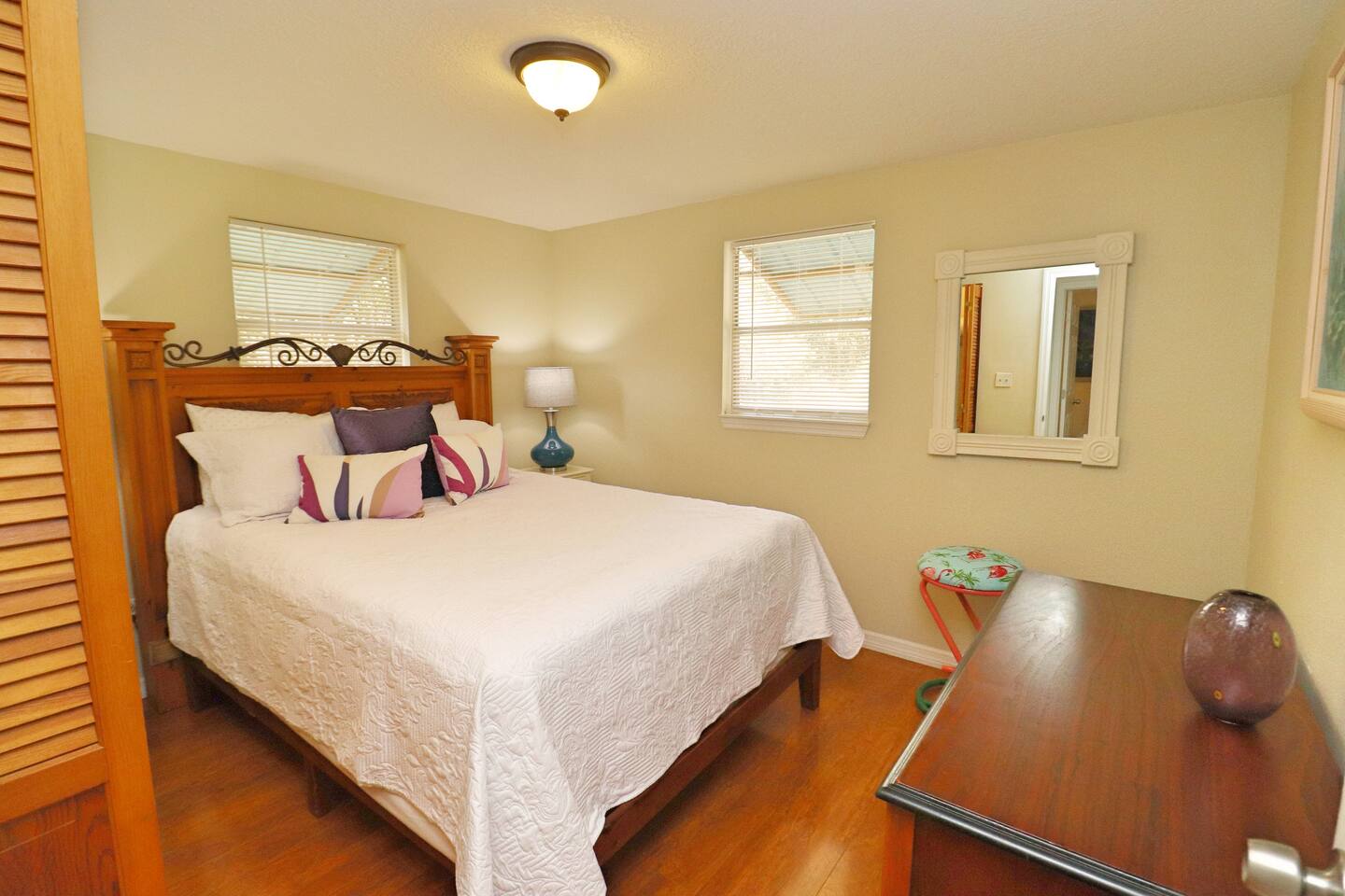 This pet-friendly unit offers plenty of space for trailer, RV, or boat parking—perfect for your next visit to New Smyrna Beach. Located just 3.5 miles from the shore, you'll enjoy a peaceful retreat while staying close to all the action. Inside, you'll find two cozy bedrooms with queen beds, a dedicated workspace with a desk, an in-unit washer and dryer, and high-speed internet. Relax on the charming screened-in front porch or unwind in the spacious, fenced-in backyard.