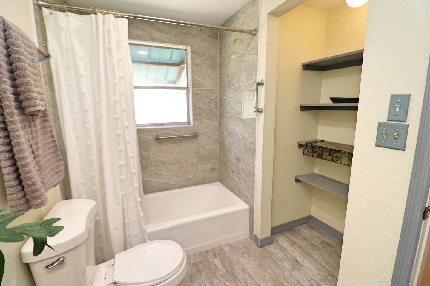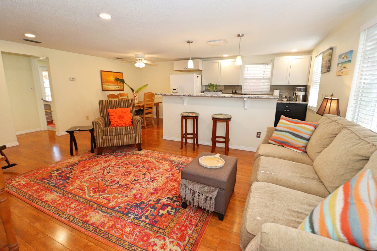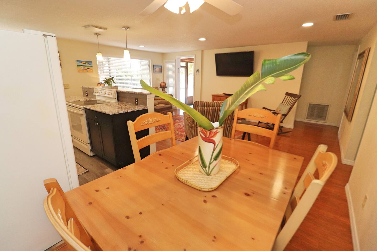 This pet-friendly unit offers plenty of space for trailer, RV, or boat parking—perfect for your next visit to New Smyrna Beach. Located just 3.5 miles from the shore, you'll enjoy a peaceful retreat while staying close to all the action. Inside, you'll find two cozy bedrooms with queen beds, a dedicated workspace with a desk, an in-unit washer and dryer, and high-speed internet. Relax on the charming screened-in front porch or unwind in the spacious, fenced-in backyard.