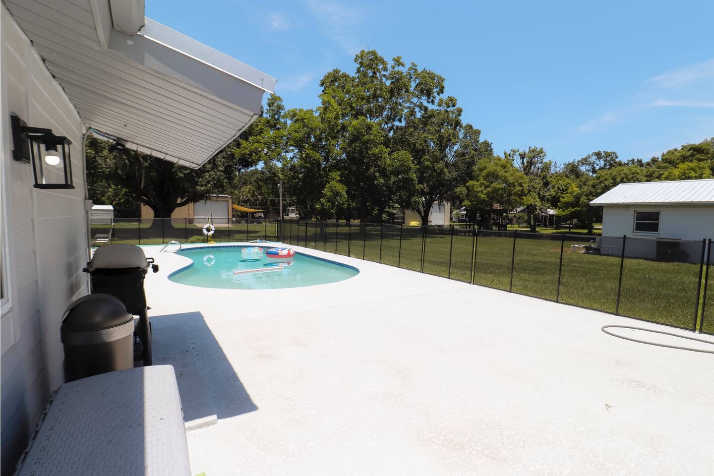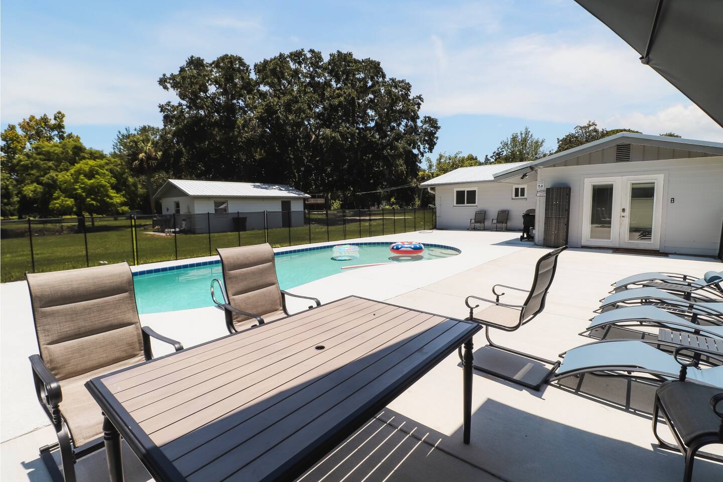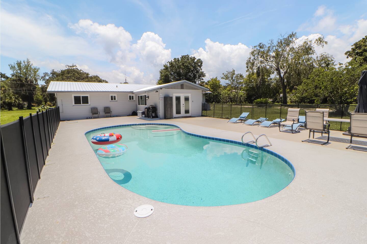 Inside, you'll find a fully equipped kitchen, comfortable bedrooms, and all the essentials to make your stay easy and enjoyable. The space: Pet Friendly Pond is shared with neighbors bur rarely used. 3 bedrooms, 2 full bathrooms—sleeps 6 Private pool with loungers & seating Beautiful stocked pond with pier and gazebo Fully equipped kitchen, washer/dryer, Wi-Fi RV-friendly: ample parking + carport This property is located just a short drive from River Breeze Park and boat ramp—bring your boat, kayaks, or paddleboards! Oak Hill is a quiet town but close to everything—20 minutes to New Smyrna Beach, and near Canaveral National Seashore.