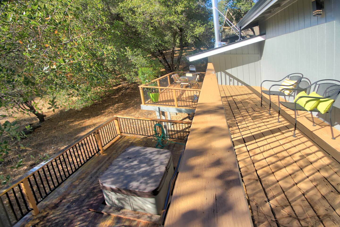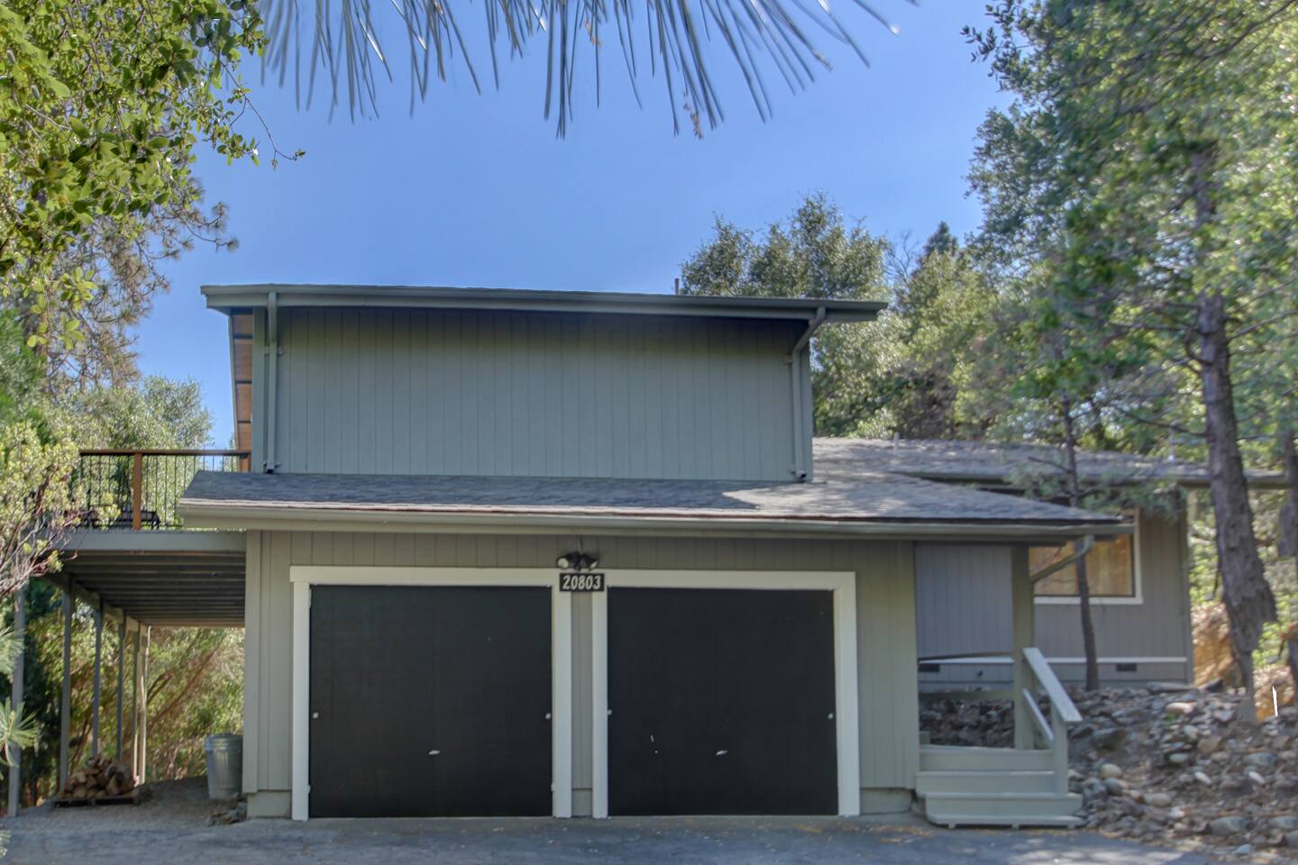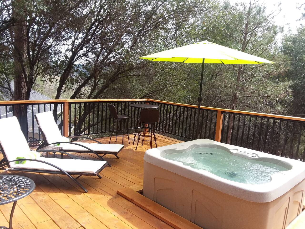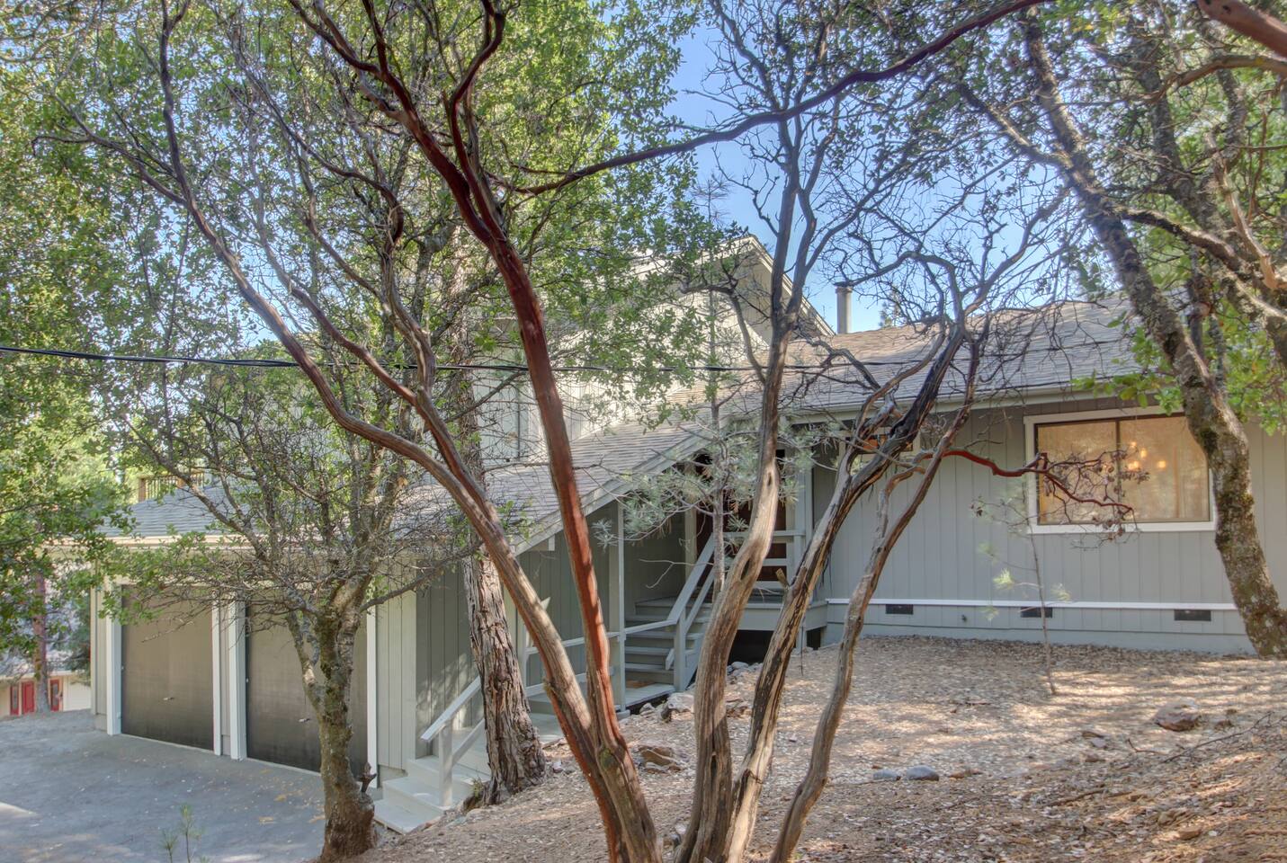 This newly re-built gem offers guests well appointed bedrooms, each with deck access, TV and electric fireplace, a large kitchen stocked with just about anything you may need, all new stainless steel appliances, a gas grill on the main level deck, new crisp white bedding, hard floors throughout,updated light fixtures and fans, and lots of lighthearted mid-century inspired art. The third level of the home hosts a large master bedroom with a king bed, a double futon, a spacious en suite full bathroom with a shower / tub combo, and a large closet. Also upstairs is a guest bedroom with a king bed, a double futon, and the Kids' Cubby, which has a full leather futon and a 55" TV with DVD player. Both rooms have deck access and far reaching views. The lower level includes a bedroom with a queen bed and a single sleeper chair, a TV and electric fireplace, and its own slider to the lower deck with the hot tub There is a laundry room with tons of extra towels and monogrammed beach towels. We have an attached garage with games and couches for your enjoyment as well. The main level has the living room, dining room, kitchen with new custom cabinets and quartz counter tops, and another full bathroom with a shower/ tub combo and access to the deck with a gas grill. Put your feet up and relax on a large, modern, leather sectional in front of a 65" smart TV with Netflix, Amazon, etc. We offer free unlimited high speed Wi-Fi. For your comfort, Egret's Landing is equipped with a thermostat which controls central heating and air. Additionally, there is a beautiful, handcrafted wood stove in the living room. While settled in nature, Egret's Landing is just a five minute drive (2.8 miles) to the MarVal grocery, Iron Door Saloon- the oldest running saloon in California, a museum, park with a climbing structure for kids' play, upscale and casual restaurants, shops, coffee houses, and local residents who are happy to share their quaint town with visitors. A day trip to the West gate of Yosemite will take about 35 minutes on nicely maintained roads, and just over an hour to the valley floor. The historic town of Columbia is a 55 minute drive and a rich, historic experience. Columbia is lively and historically staged, recreating a classic booming gold rush era town where you will see proprietors dressed in 1850s era clothing, ride a stagecoach, pan for gold, browse 1850s era shops, picnic, dine, or just enjoy the sights strolling with an ice cream on the old, historic sidewalks. Within the PML community, you will have access to an 18 hole championship golf course, clubhouse/ grill, beaches, a seasonal casual beach restaurant, seasonal boat and kayak rentals, a water taxi to take you between the three beaches, equestrian center, numerous hiking trails, archery and shooting ranges, a public swimming pool, tennis and pickleball courts, and more! Exquisite views will surround you while enjoying quiet starry evenings and tranquil sunrises in the hot tub on an expansive deck. Located near beautiful Big Creek, wildlife including deer and wild turkeys saunter through the property daily. Take a 5-10 minute walk to the Big Creek trail head and listen to the water make it's way to Pine Mountain Lake while you walk along a well maintained path. Thank you for considering a stay as our guests. We are accommodating, friendly, and available to answer questions or share tips about the area to make your trip to this wonderful area just as magical as you hope it to be! *****There is a one time, per car fee of $46 which goes directly toward maintenance for the community. The personnel at the front gate of the community collect this fee and you pay pay using cash or credit card.******
