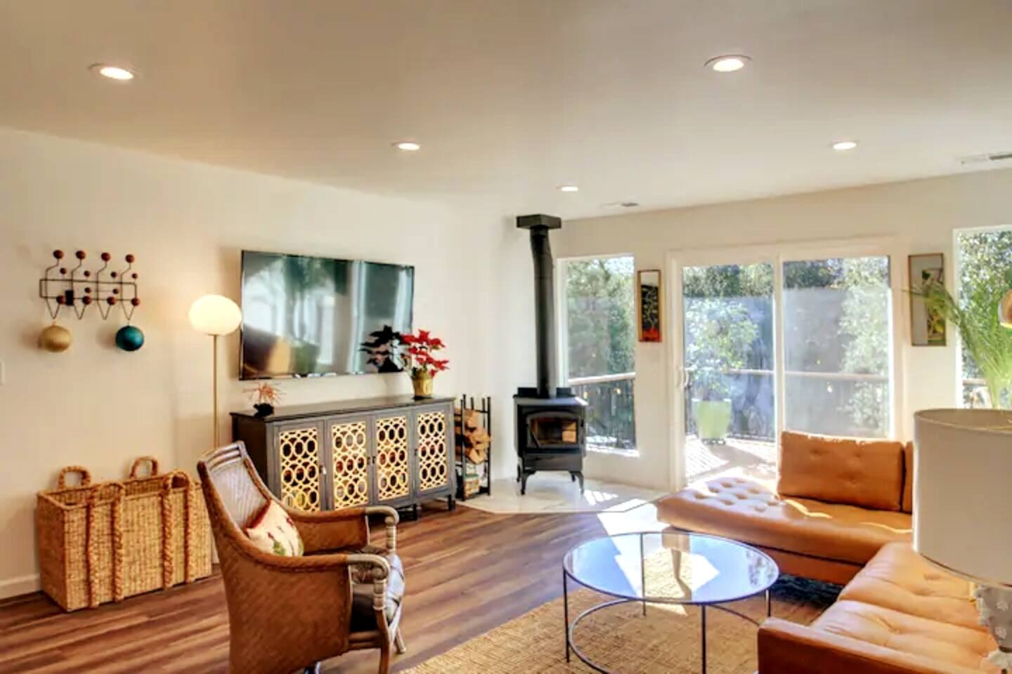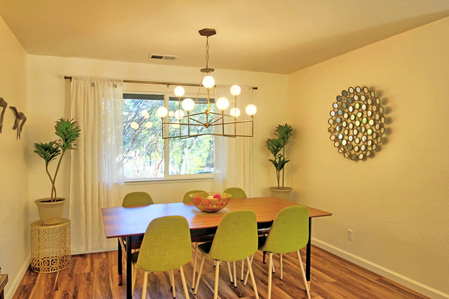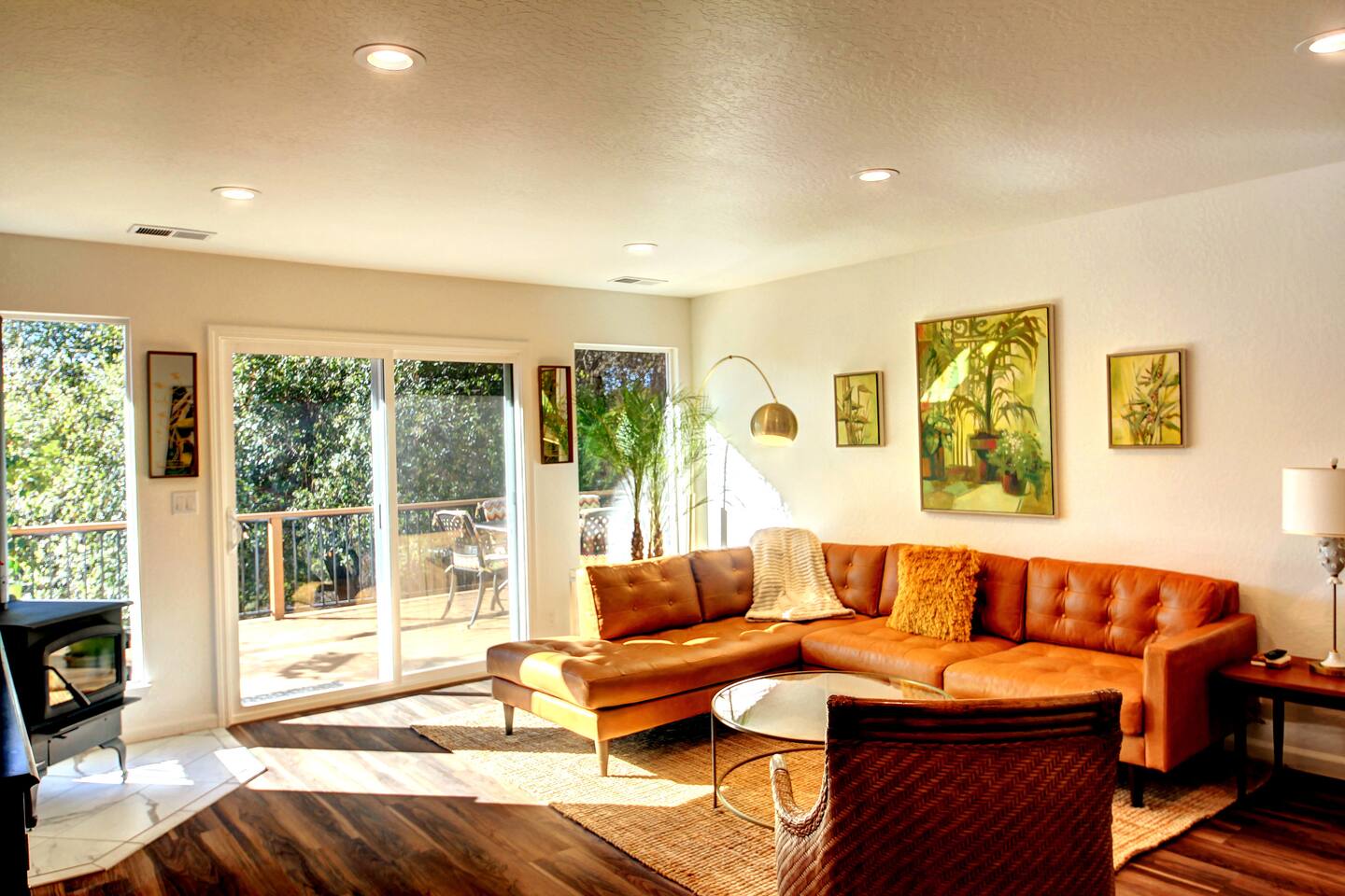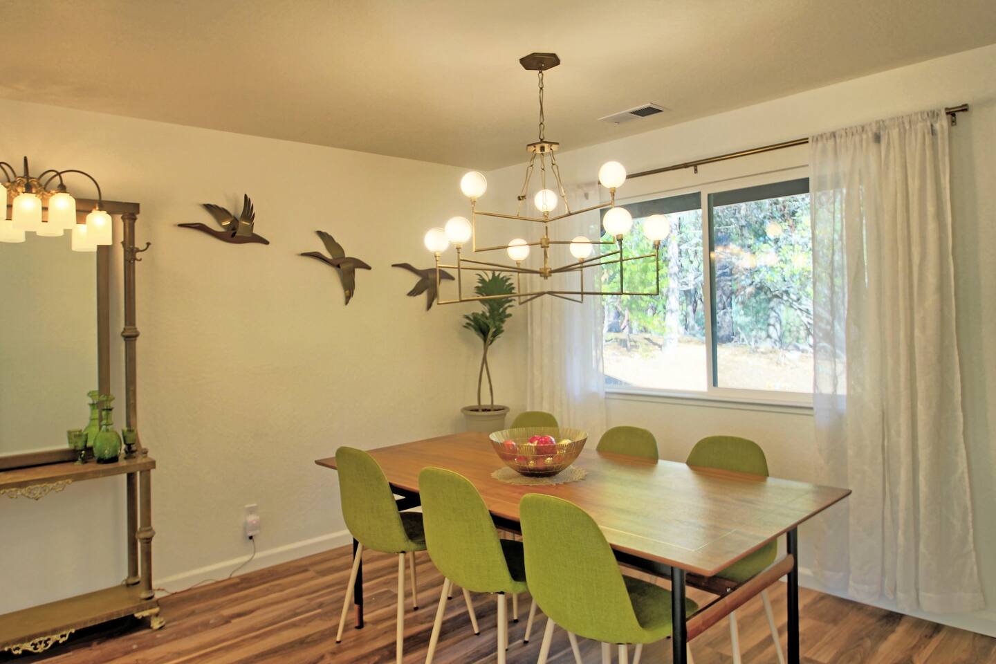 This newly re-built gem offers guests well appointed bedrooms, each with deck access, TV and electric fireplace, a large kitchen stocked with just about anything you may need, all new stainless steel appliances, a gas grill on the main level deck, new crisp white bedding, hard floors throughout,updated light fixtures and fans, and lots of lighthearted mid-century inspired art. The third level of the home hosts a large master bedroom with a king bed, a double futon, a spacious en suite full bathroom with a shower / tub combo, and a large closet. Also upstairs is a guest bedroom with a king bed, a double futon, and the Kids' Cubby, which has a full leather futon and a 55" TV with DVD player. Both rooms have deck access and far reaching views. The lower level includes a bedroom with a queen bed and a single sleeper chair, a TV and electric fireplace, and its own slider to the lower deck with the hot tub There is a laundry room with tons of extra towels and monogrammed beach towels. We have an attached garage with games and couches for your enjoyment as well. The main level has the living room, dining room, kitchen with new custom cabinets and quartz counter tops, and another full bathroom with a shower/ tub combo and access to the deck with a gas grill. Put your feet up and relax on a large, modern, leather sectional in front of a 65" smart TV with Netflix, Amazon, etc. We offer free unlimited high speed Wi-Fi. For your comfort, Egret's Landing is equipped with a thermostat which controls central heating and air. Additionally, there is a beautiful, handcrafted wood stove in the living room. While settled in nature, Egret's Landing is just a five minute drive (2.8 miles) to the MarVal grocery, Iron Door Saloon- the oldest running saloon in California, a museum, park with a climbing structure for kids' play, upscale and casual restaurants, shops, coffee houses, and local residents who are happy to share their quaint town with visitors. A day trip to the West gate of Yosemite will take about 35 minutes on nicely maintained roads, and just over an hour to the valley floor. The historic town of Columbia is a 55 minute drive and a rich, historic experience. Columbia is lively and historically staged, recreating a classic booming gold rush era town where you will see proprietors dressed in 1850s era clothing, ride a stagecoach, pan for gold, browse 1850s era shops, picnic, dine, or just enjoy the sights strolling with an ice cream on the old, historic sidewalks. Within the PML community, you will have access to an 18 hole championship golf course, clubhouse/ grill, beaches, a seasonal casual beach restaurant, seasonal boat and kayak rentals, a water taxi to take you between the three beaches, equestrian center, numerous hiking trails, archery and shooting ranges, a public swimming pool, tennis and pickleball courts, and more! Exquisite views will surround you while enjoying quiet starry evenings and tranquil sunrises in the hot tub on an expansive deck. Located near beautiful Big Creek, wildlife including deer and wild turkeys saunter through the property daily. Take a 5-10 minute walk to the Big Creek trail head and listen to the water make it's way to Pine Mountain Lake while you walk along a well maintained path. Thank you for considering a stay as our guests. We are accommodating, friendly, and available to answer questions or share tips about the area to make your trip to this wonderful area just as magical as you hope it to be! *****There is a one time, per car fee of $46 which goes directly toward maintenance for the community. The personnel at the front gate of the community collect this fee and you pay pay using cash or credit card.******