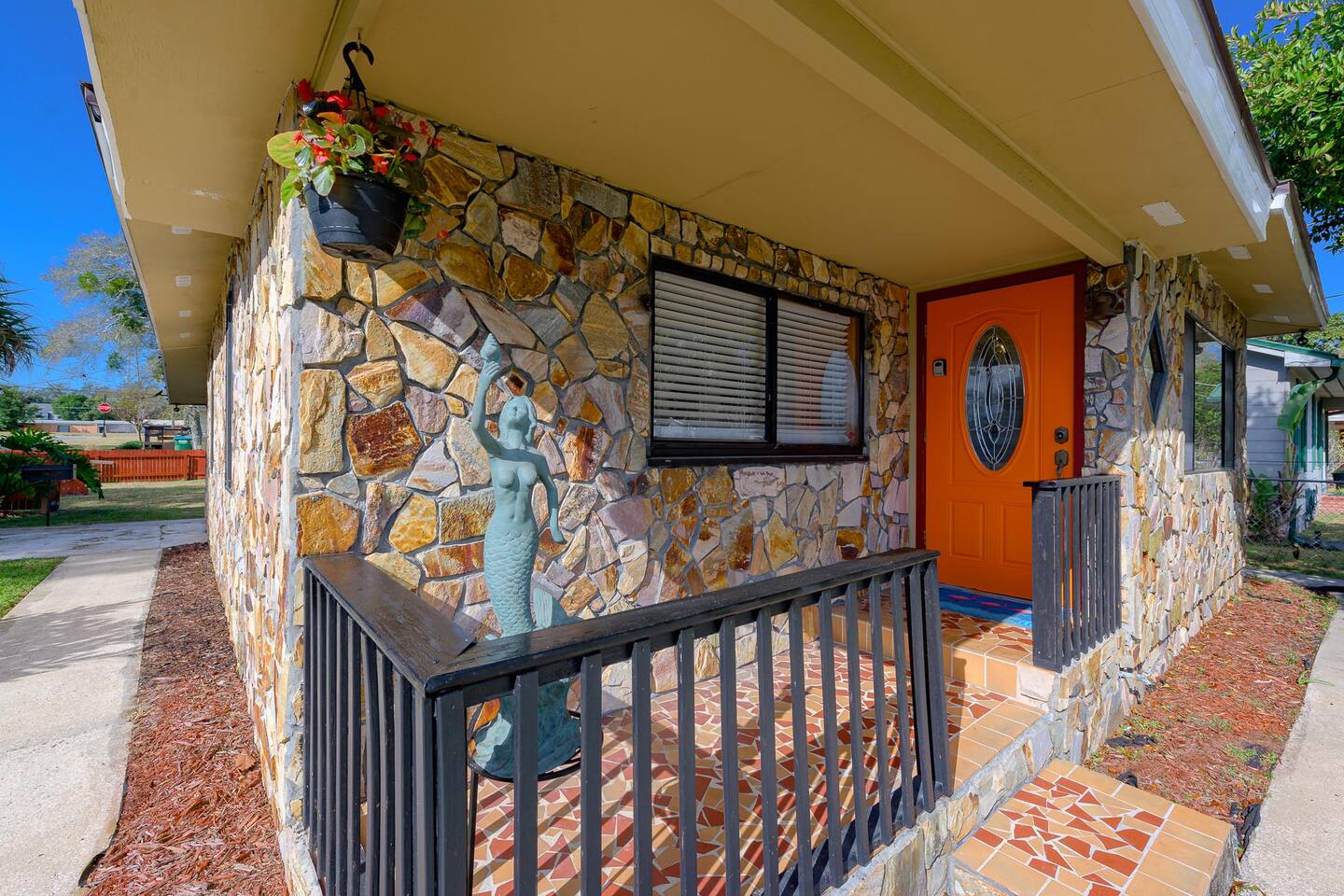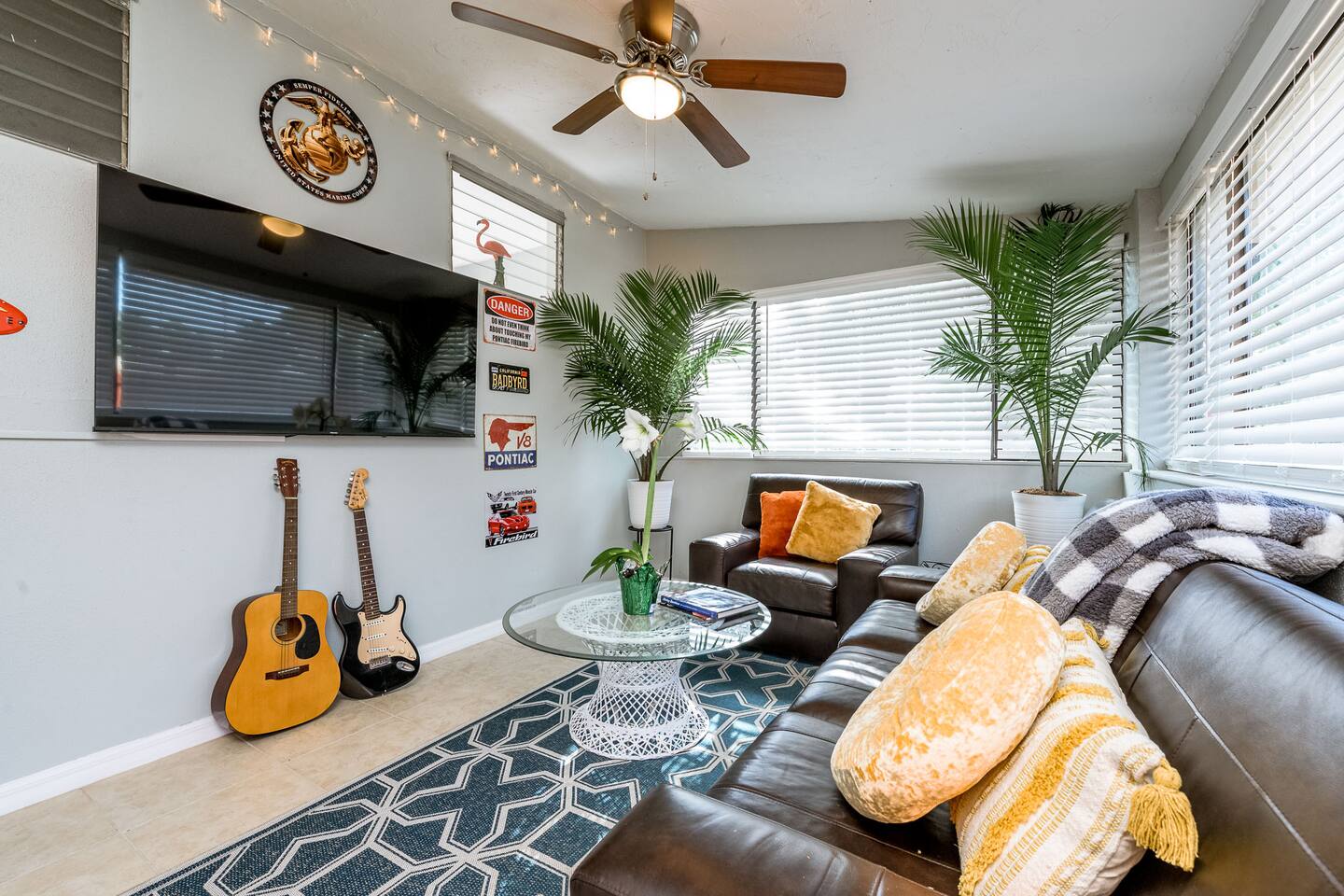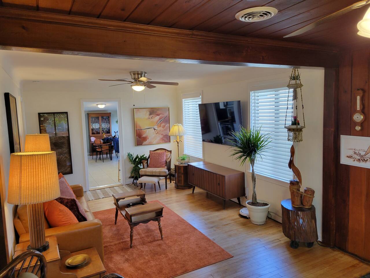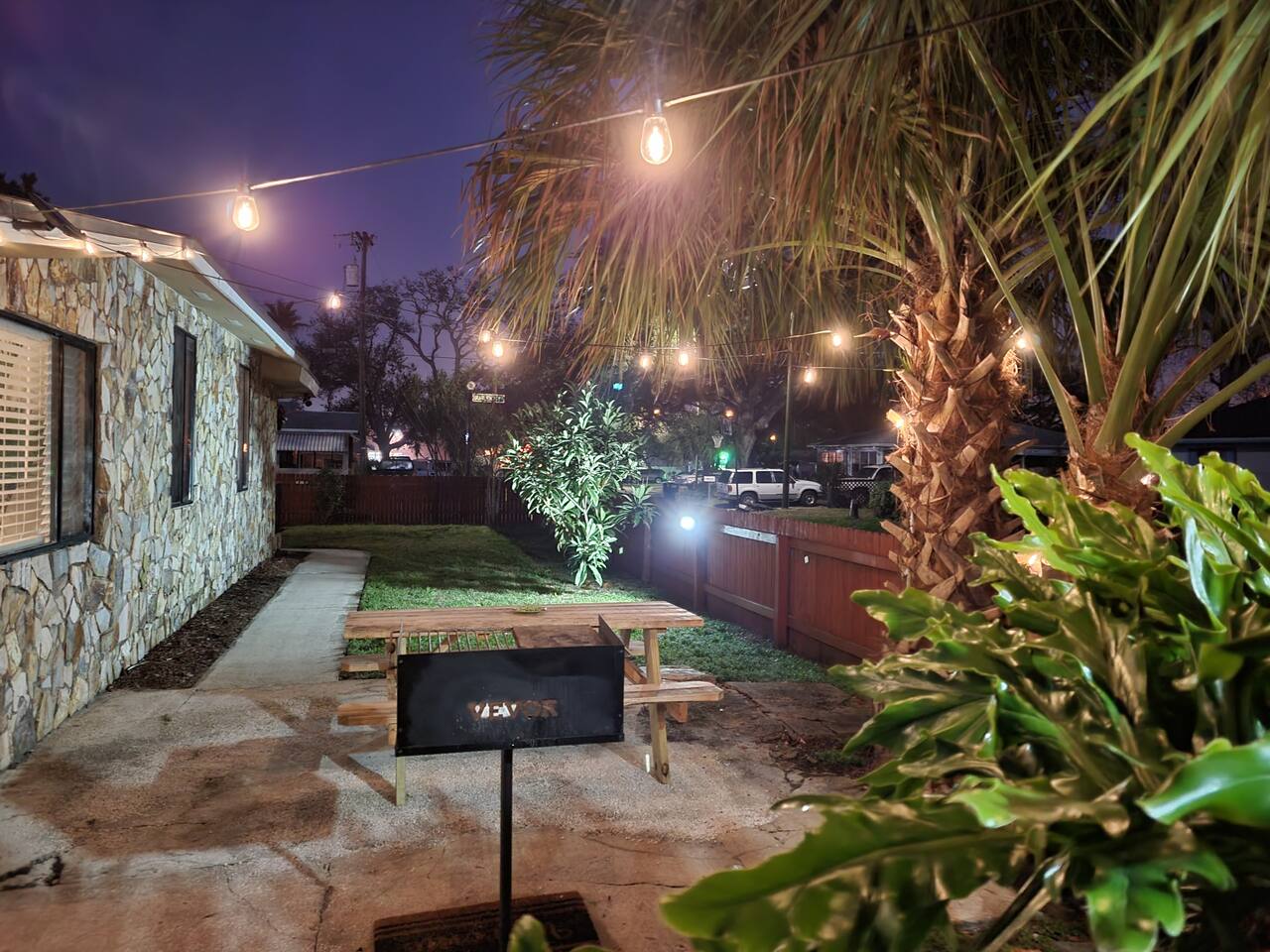 This charming home is a two bedroom, two living room one bath residential house located at the west end of the famous Seabreeze Bridge. There is a large lot that is completely fenced in with wide double gates to bring your car(s), boat, motorcycles, etc, through and park under a double carport. The house has been updated in 2021 and 2022 with new AC, a new HVAC handler, and a tankless water heater. The original hardwood floors were refurbished in 2022. We've decorated the house with many original Florida mid-century modern art and furniture pieces to try and pay homage to the house's age and design. The master bedroom has two closets (his and hers), a 55" TV and a new queen bed. The guest room has one closet, a new queen bed, and a 50" TV. There is both a formal living room and a family fun room. Both have 65" TVs! The kitchen has an attached dining area that seats four. Outside, there is a picnic table and a classic picnic/park charcoal grill all lit at night by beautiful string lights. Hi Speed WiFi from Spectrum allows you to watch all your streaming shows. Super fast internet, and we get 5G here.