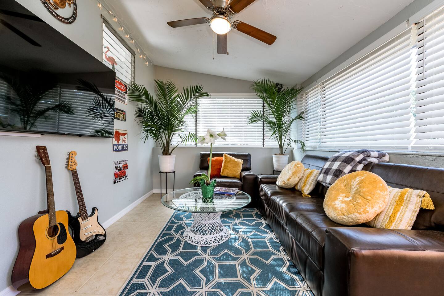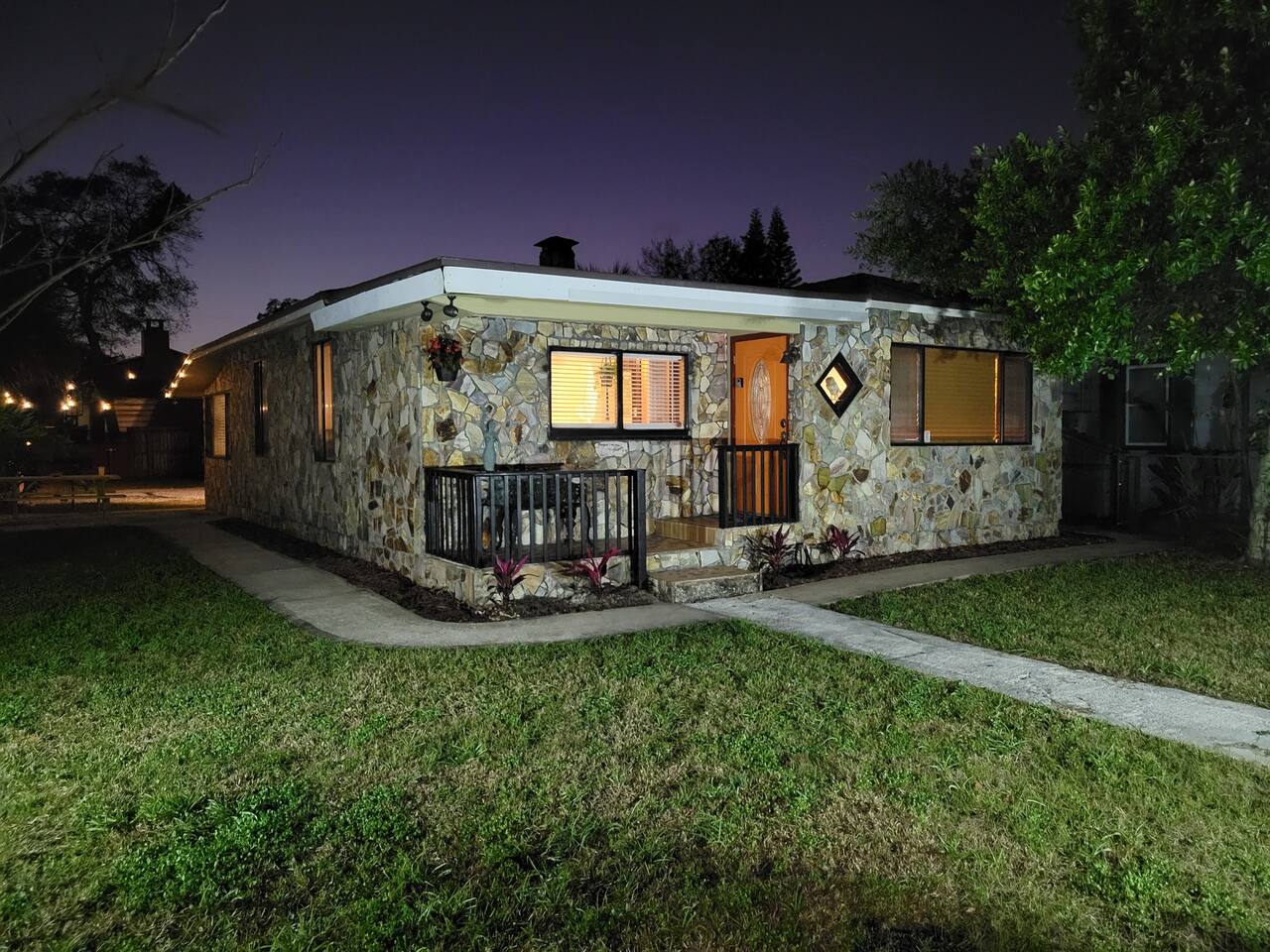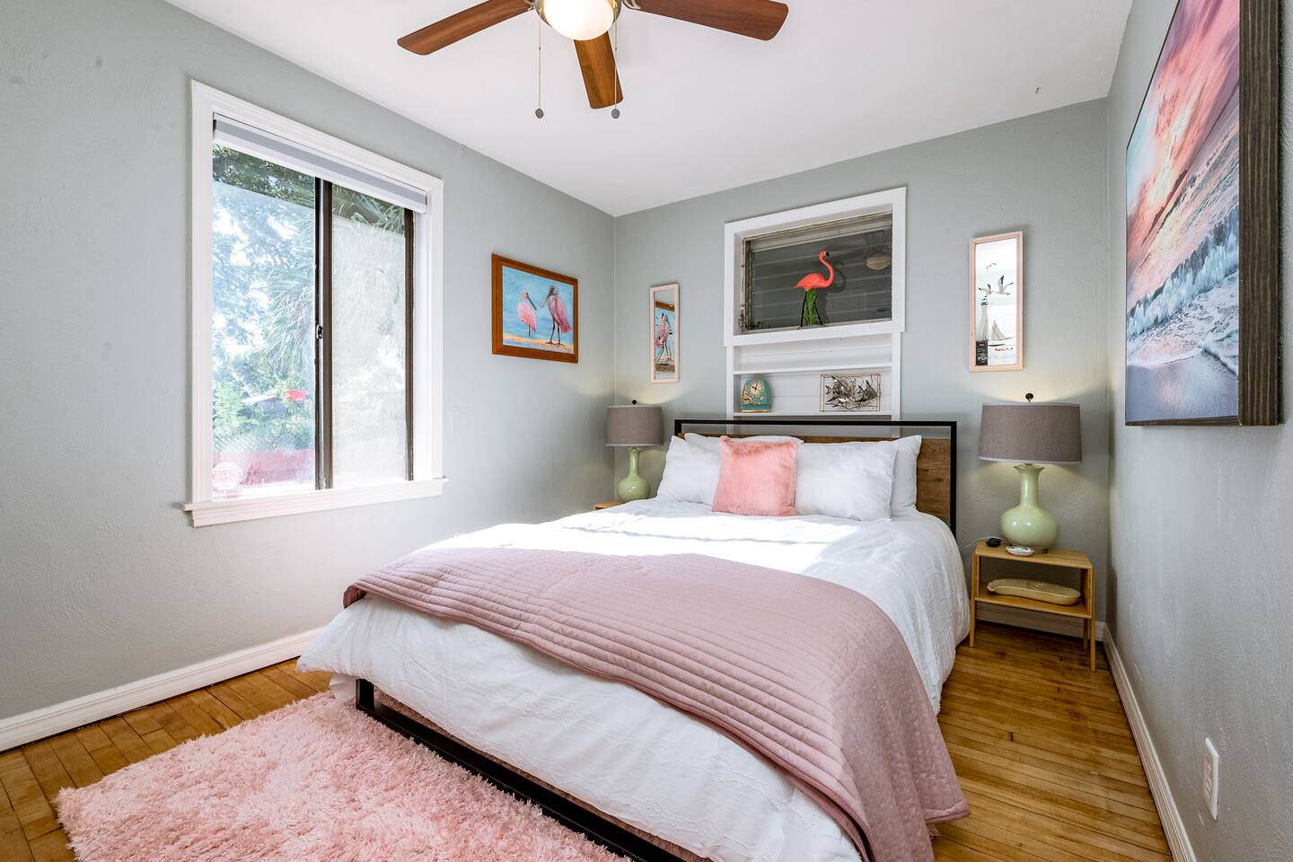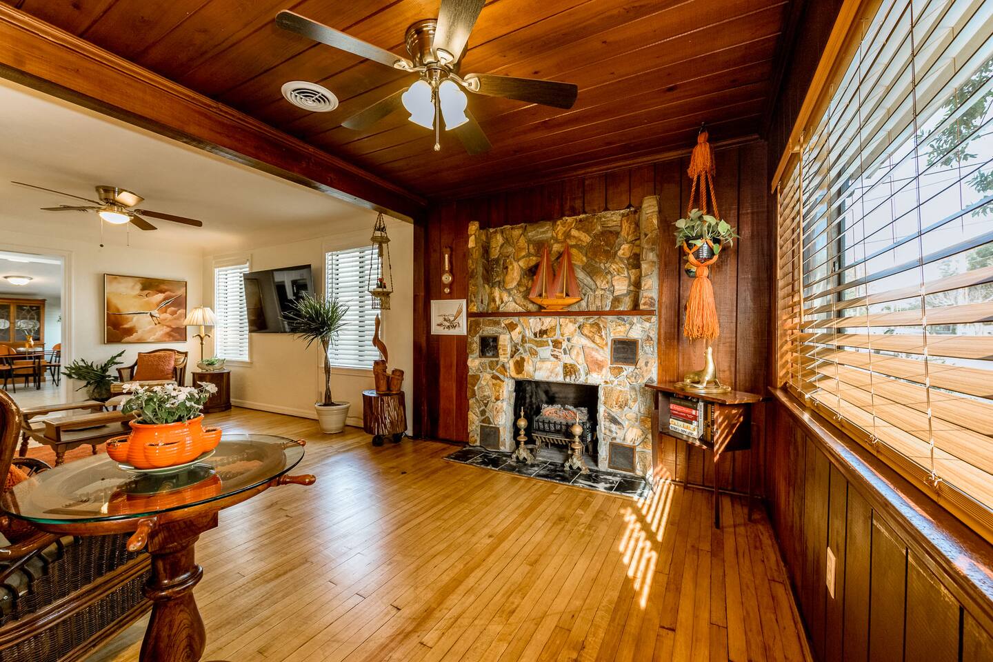 This charming home is a two bedroom, two living room one bath residential house located at the west end of the famous Seabreeze Bridge. There is a large lot that is completely fenced in with wide double gates to bring your car(s), boat, motorcycles, etc, through and park under a double carport. The house has been updated in 2021 and 2022 with new AC, a new HVAC handler, and a tankless water heater. The original hardwood floors were refurbished in 2022. We've decorated the house with many original Florida mid-century modern art and furniture pieces to try and pay homage to the house's age and design. The master bedroom has two closets (his and hers), a 55" TV and a new queen bed. The guest room has one closet, a new queen bed, and a 50" TV. There is both a formal living room and a family fun room. Both have 65" TVs! The kitchen has an attached dining area that seats four. Outside, there is a picnic table and a classic picnic/park charcoal grill all lit at night by beautiful string lights. Hi Speed WiFi from Spectrum allows you to watch all your streaming shows. Super fast internet, and we get 5G here.