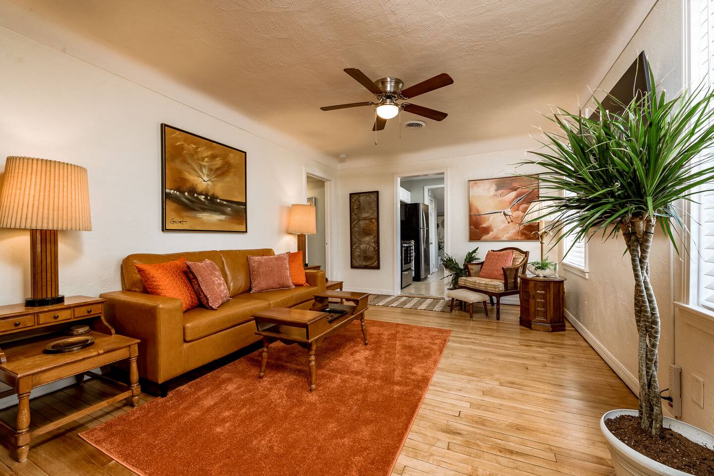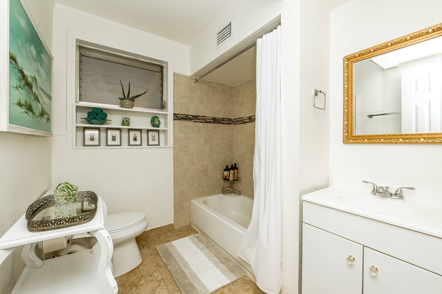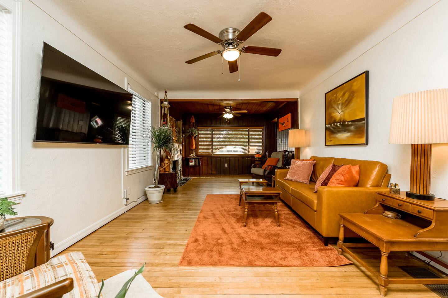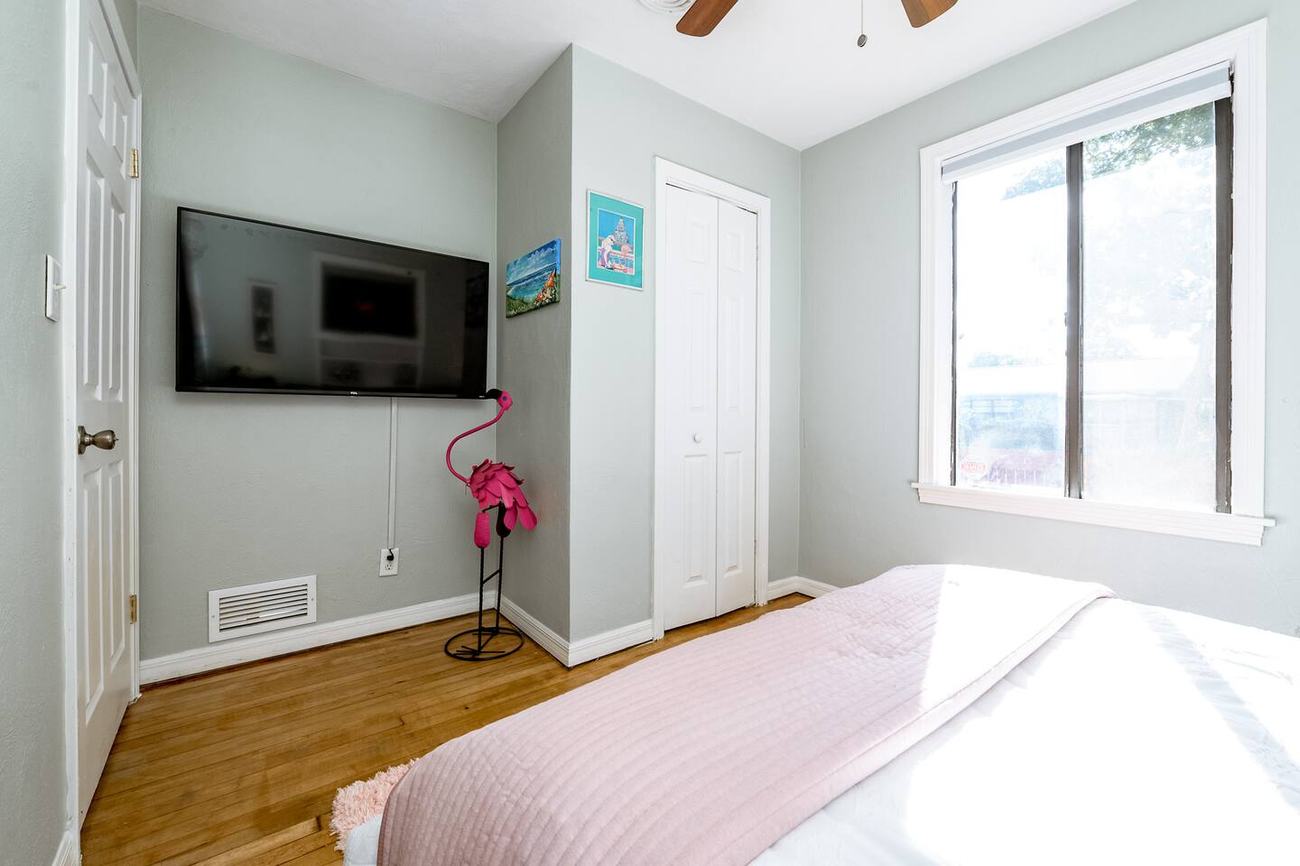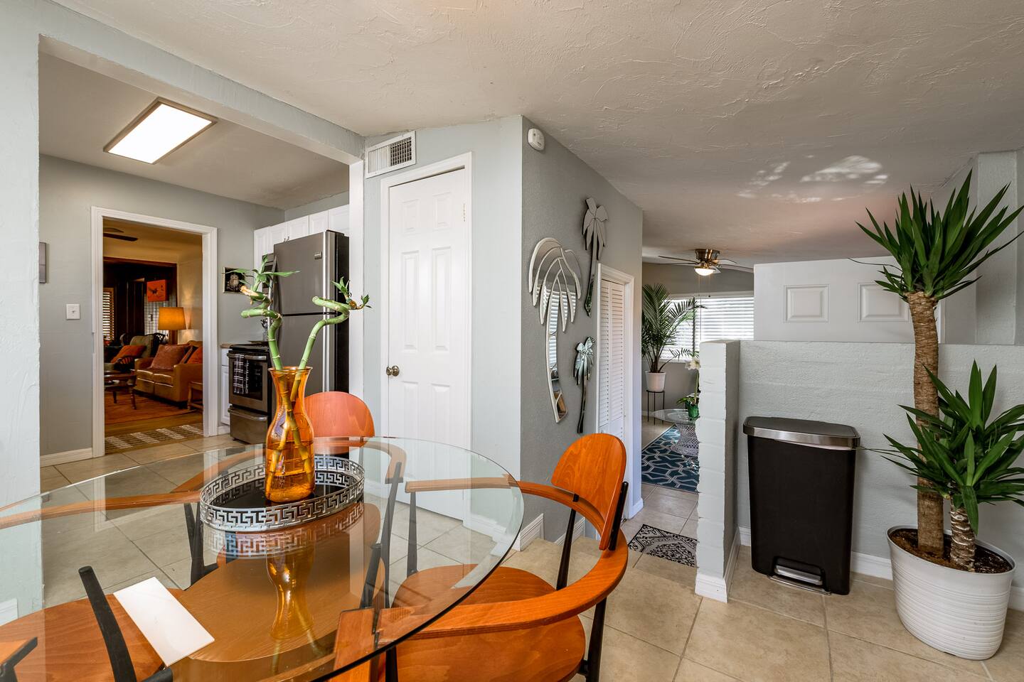 This charming home is a two bedroom, two living room one bath residential house located at the west end of the famous Seabreeze Bridge. There is a large lot that is completely fenced in with wide double gates to bring your car(s), boat, motorcycles, etc, through and park under a double carport. The house has been updated in 2021 and 2022 with new AC, a new HVAC handler, and a tankless water heater. The original hardwood floors were refurbished in 2022. We've decorated the house with many original Florida mid-century modern art and furniture pieces to try and pay homage to the house's age and design. The master bedroom has two closets (his and hers), a 55" TV and a new queen bed. The guest room has one closet, a new queen bed, and a 50" TV. There is both a formal living room and a family fun room. Both have 65" TVs! The kitchen has an attached dining area that seats four. Outside, there is a picnic table and a classic picnic/park charcoal grill all lit at night by beautiful string lights. Hi Speed WiFi from Spectrum allows you to watch all your streaming shows. Super fast internet, and we get 5G here.