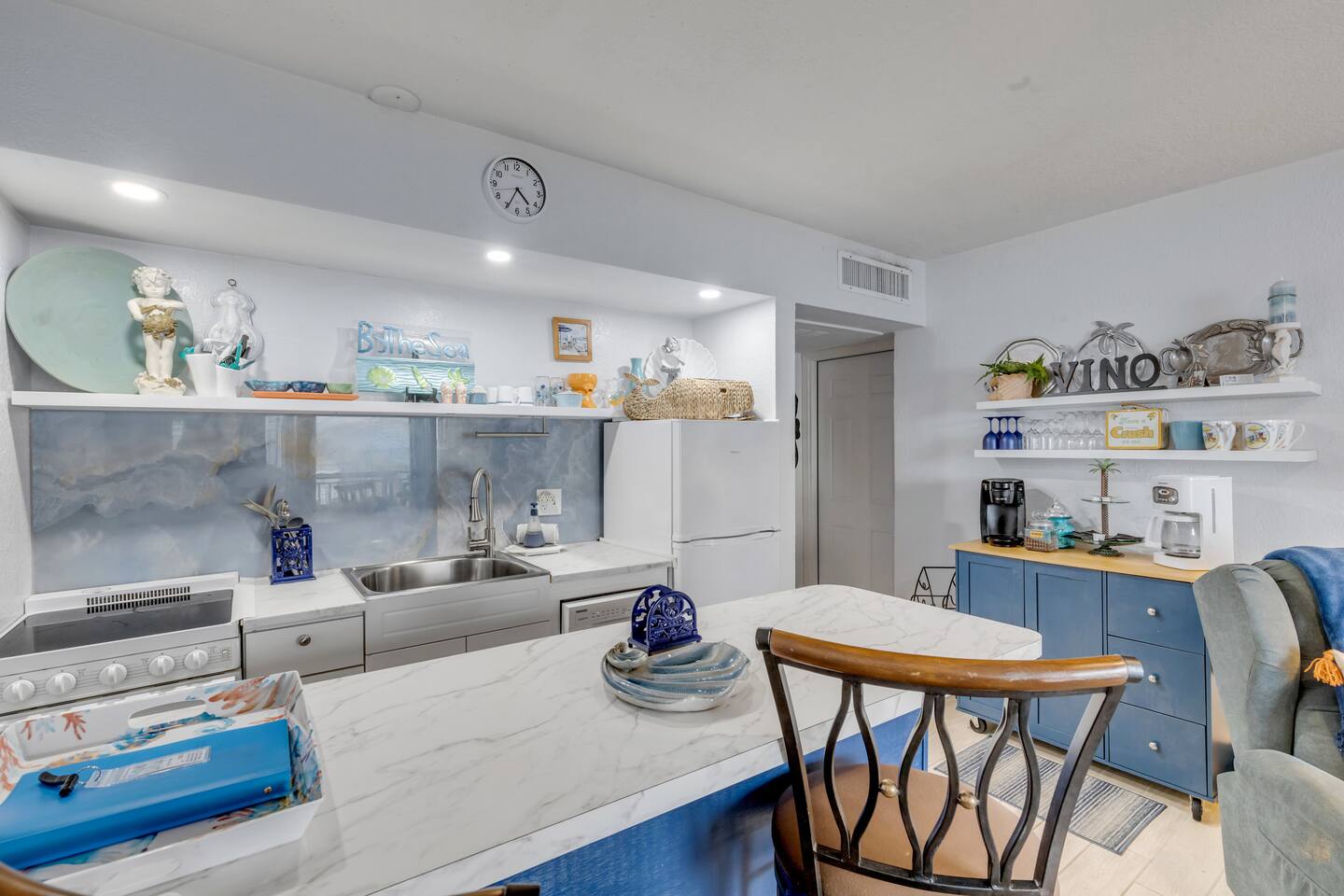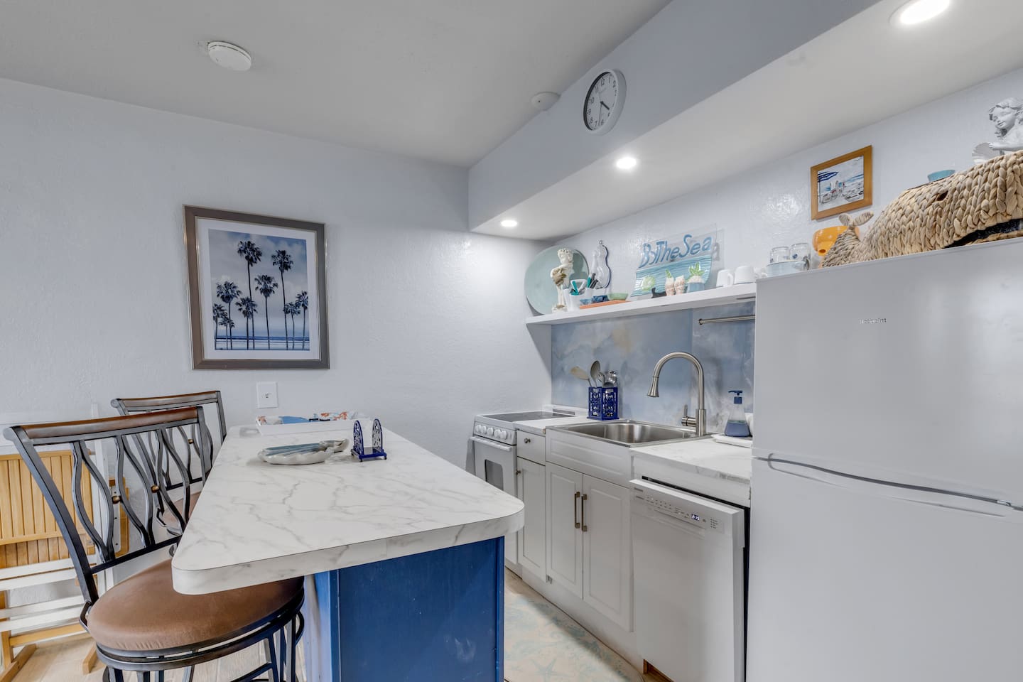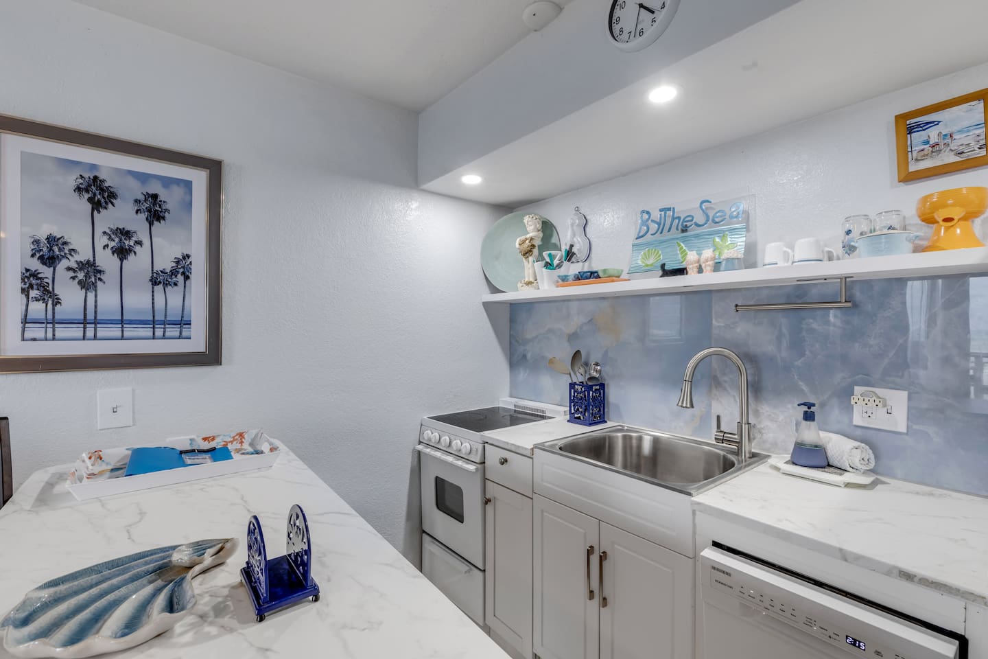 Oceanfront 1-bedroom condo with stunning ocean views • Queen bed + full size pull-out sofa, sleeps 2 comfortably • Fully stocked kitchen with everything you need for beach meals • Steps from the beach, boardwalk, and popular restaurants & bars • Oceanfront pool for relaxing after a day in the sun