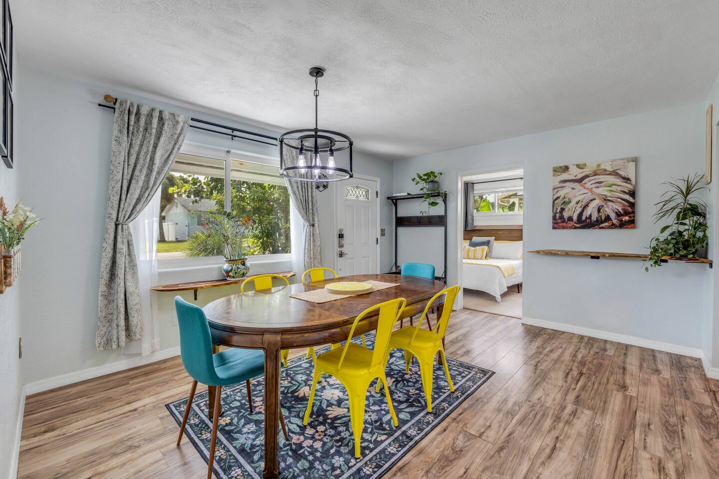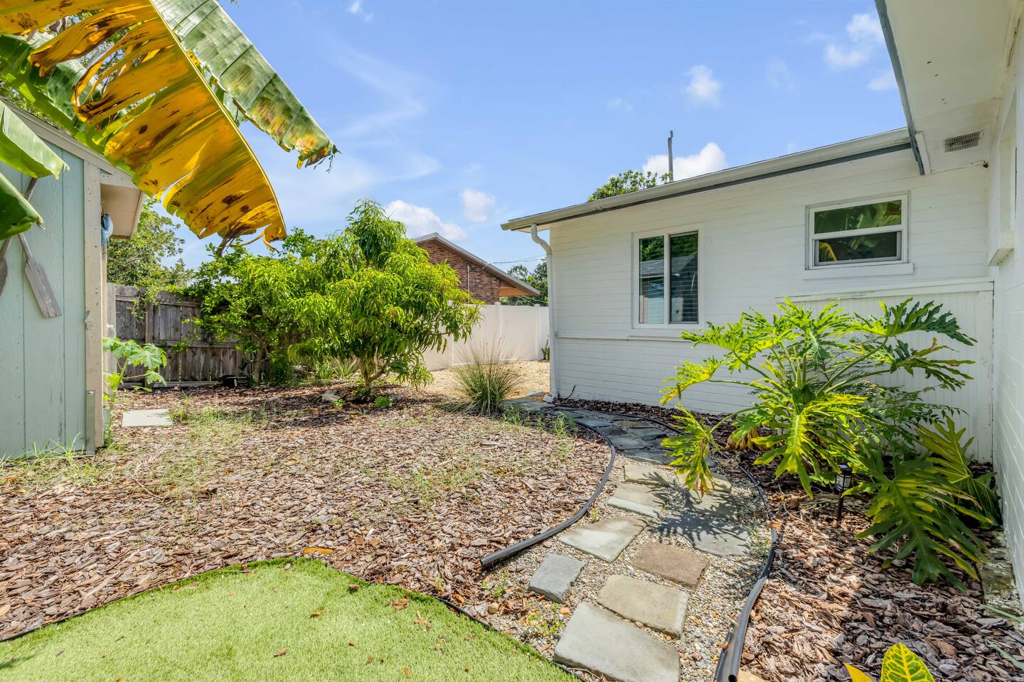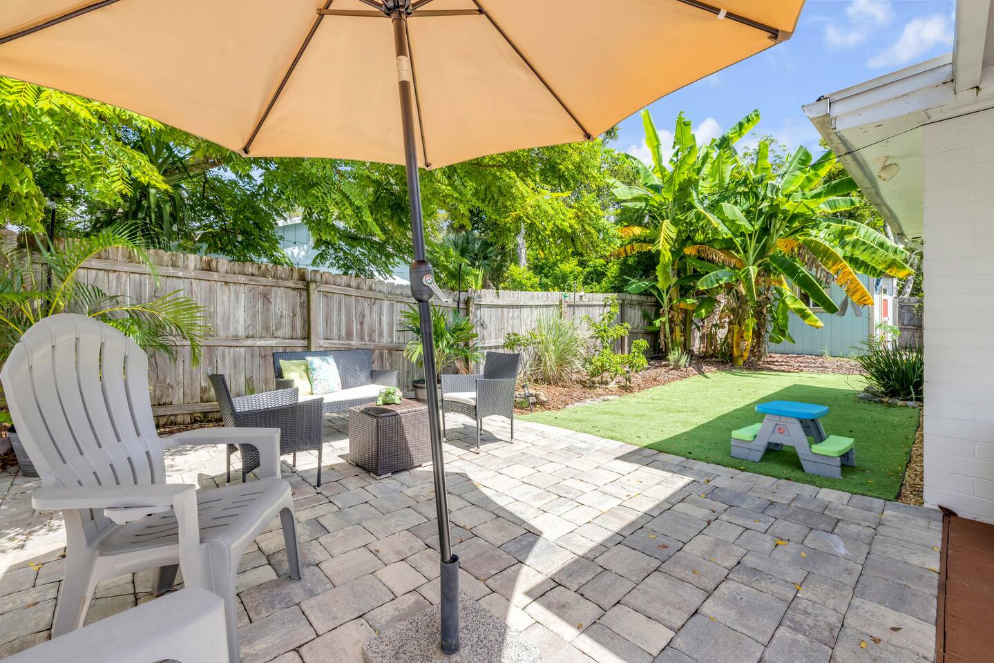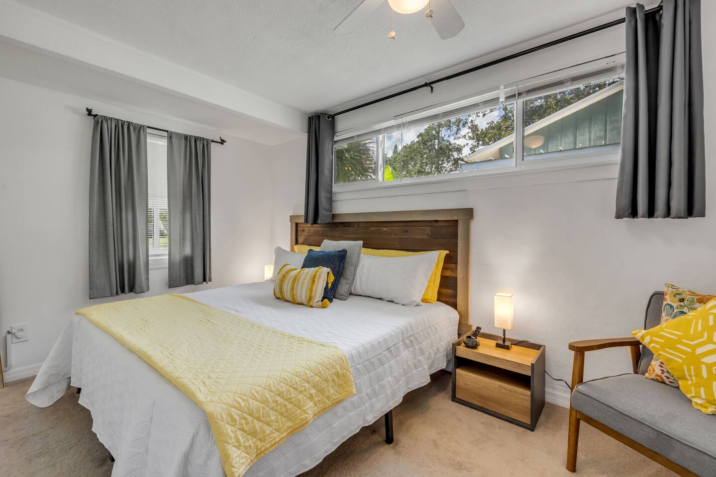 Welcome to your home away from home! This charming retreat is designed for comfort and convenience, offering everything you need for a relaxing stay. Located just 10 minutes from the beach and close to the vibrant dining, shopping, and nightlife of Flagler Avenue and Canal Street, you’ll be right in the heart of it all. Inside, the home sleeps six guests comfortably with three bedrooms and two bathrooms. The primary bedroom features a king bed, another offers two twin beds, and the third includes a pull-out couch along with a private office space—perfect for remote work or a quiet reading nook. The fully equipped kitchen comes with updated stainless steel appliances, while the bright, open living areas are filled with natural light, creating a warm and welcoming atmosphere. Step outside to your own private fenced backyard, complete with lush astro turf, plenty of room to relax or play, and an outdoor shower to rinse off after a day on the water or at the beach. Boaters will love the secure backyard parking, just one block from the Indian River Lagoon. With its comfortable layout, great amenities, and unbeatable location, this home is the perfect spot for families, groups, or anyone looking to experience the best of New Smyrna Beach.