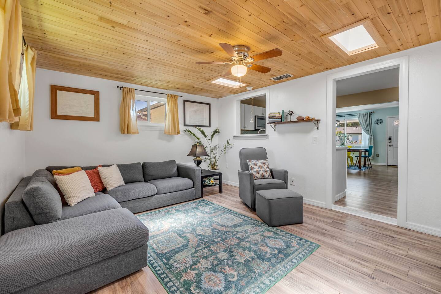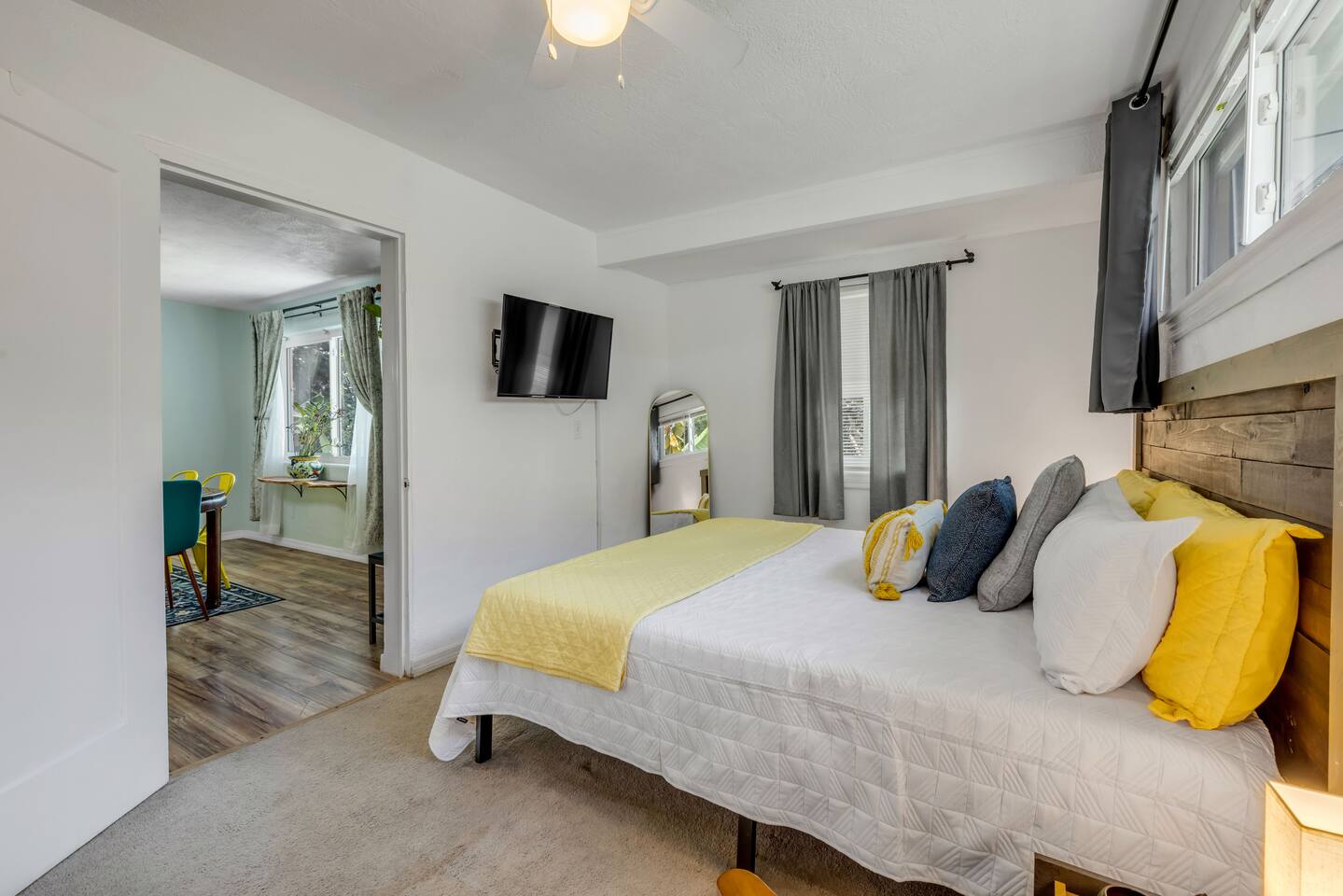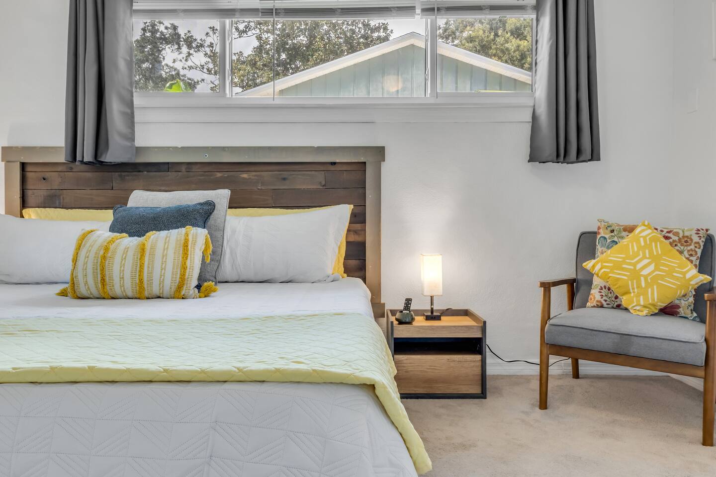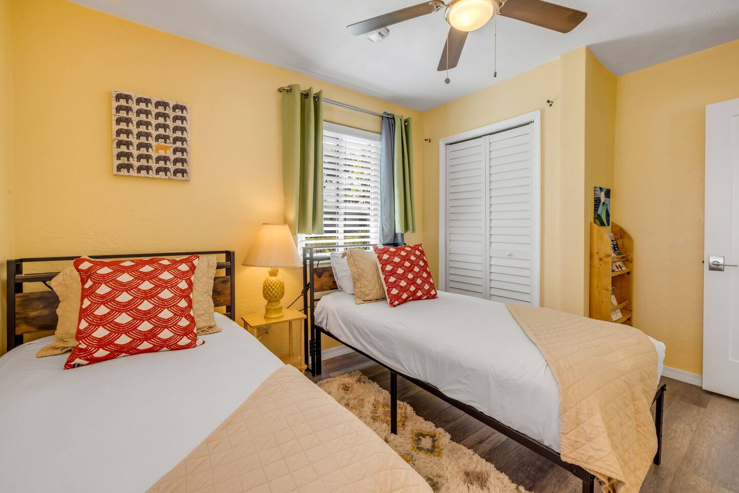 Welcome to your home away from home! This charming retreat is designed for comfort and convenience, offering everything you need for a relaxing stay. Located just 10 minutes from the beach and close to the vibrant dining, shopping, and nightlife of Flagler Avenue and Canal Street, you’ll be right in the heart of it all. Inside, the home sleeps six guests comfortably with three bedrooms and two bathrooms. The primary bedroom features a king bed, another offers two twin beds, and the third includes a pull-out couch along with a private office space—perfect for remote work or a quiet reading nook. The fully equipped kitchen comes with updated stainless steel appliances, while the bright, open living areas are filled with natural light, creating a warm and welcoming atmosphere. Step outside to your own private fenced backyard, complete with lush astro turf, plenty of room to relax or play, and an outdoor shower to rinse off after a day on the water or at the beach. Boaters will love the secure backyard parking, just one block from the Indian River Lagoon. With its comfortable layout, great amenities, and unbeatable location, this home is the perfect spot for families, groups, or anyone looking to experience the best of New Smyrna Beach.