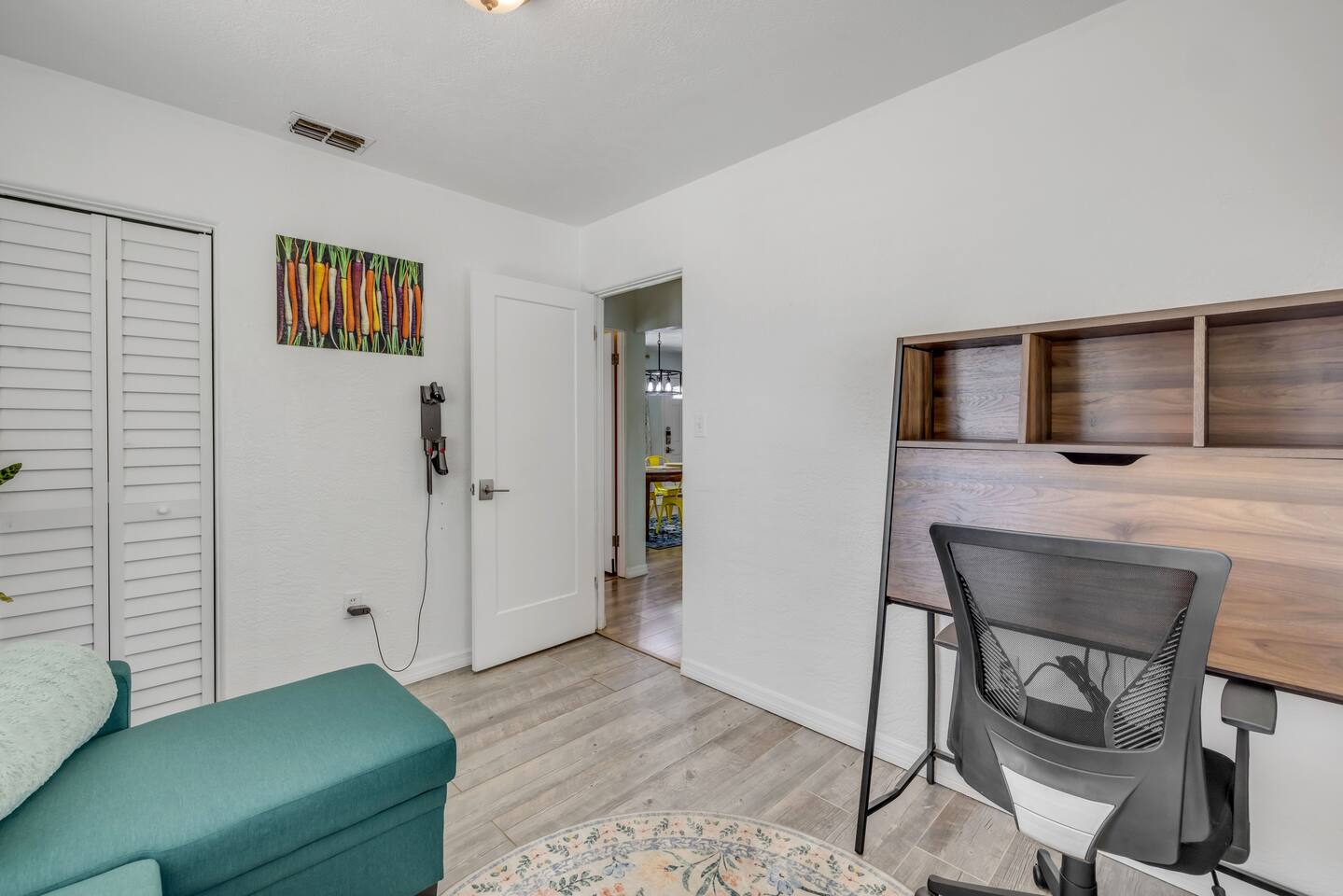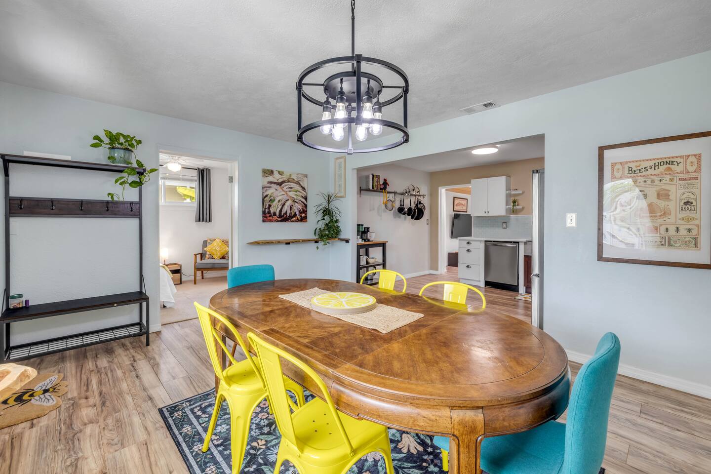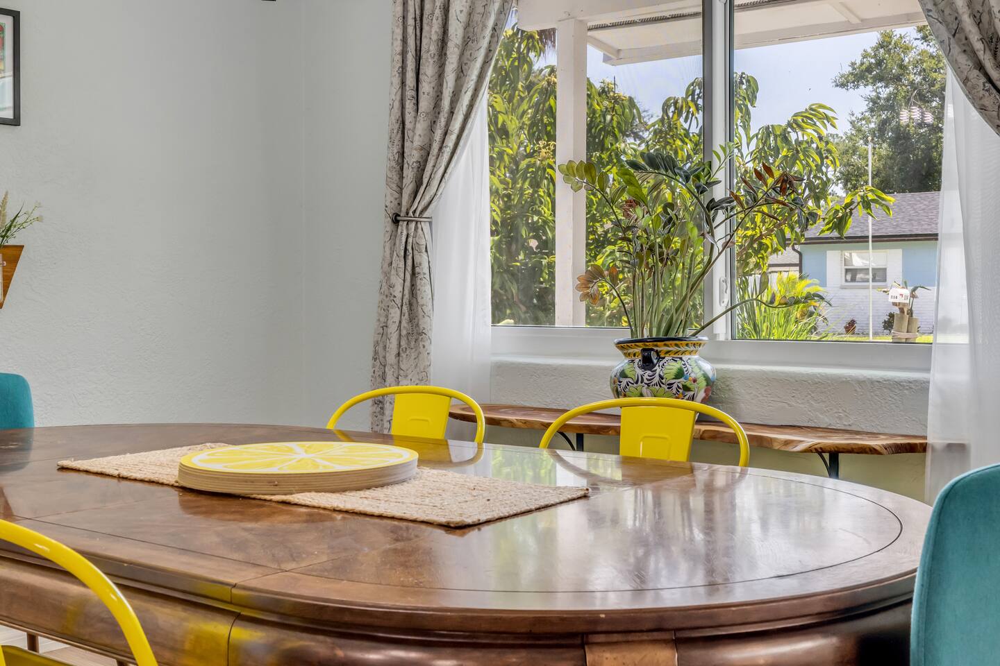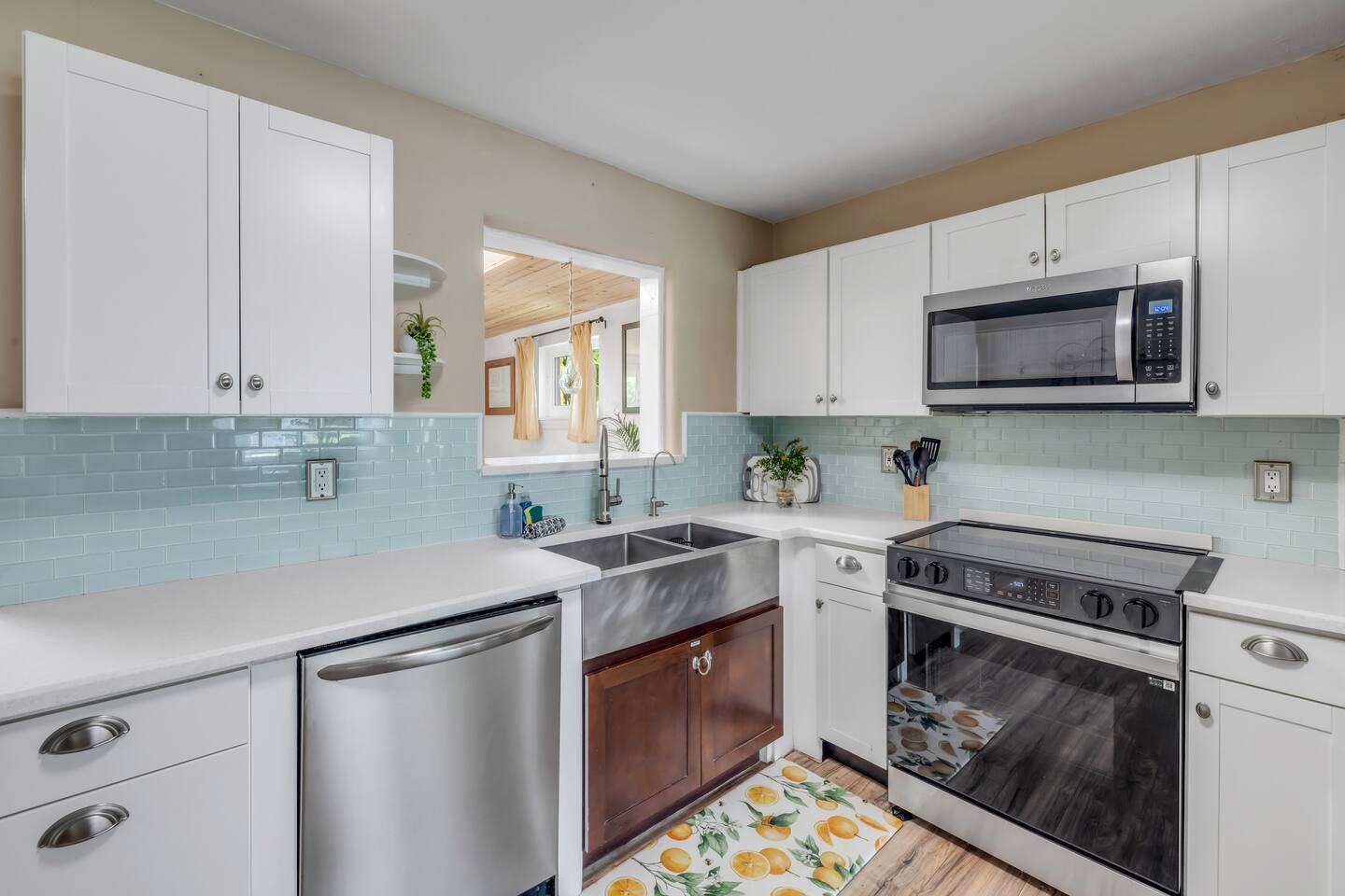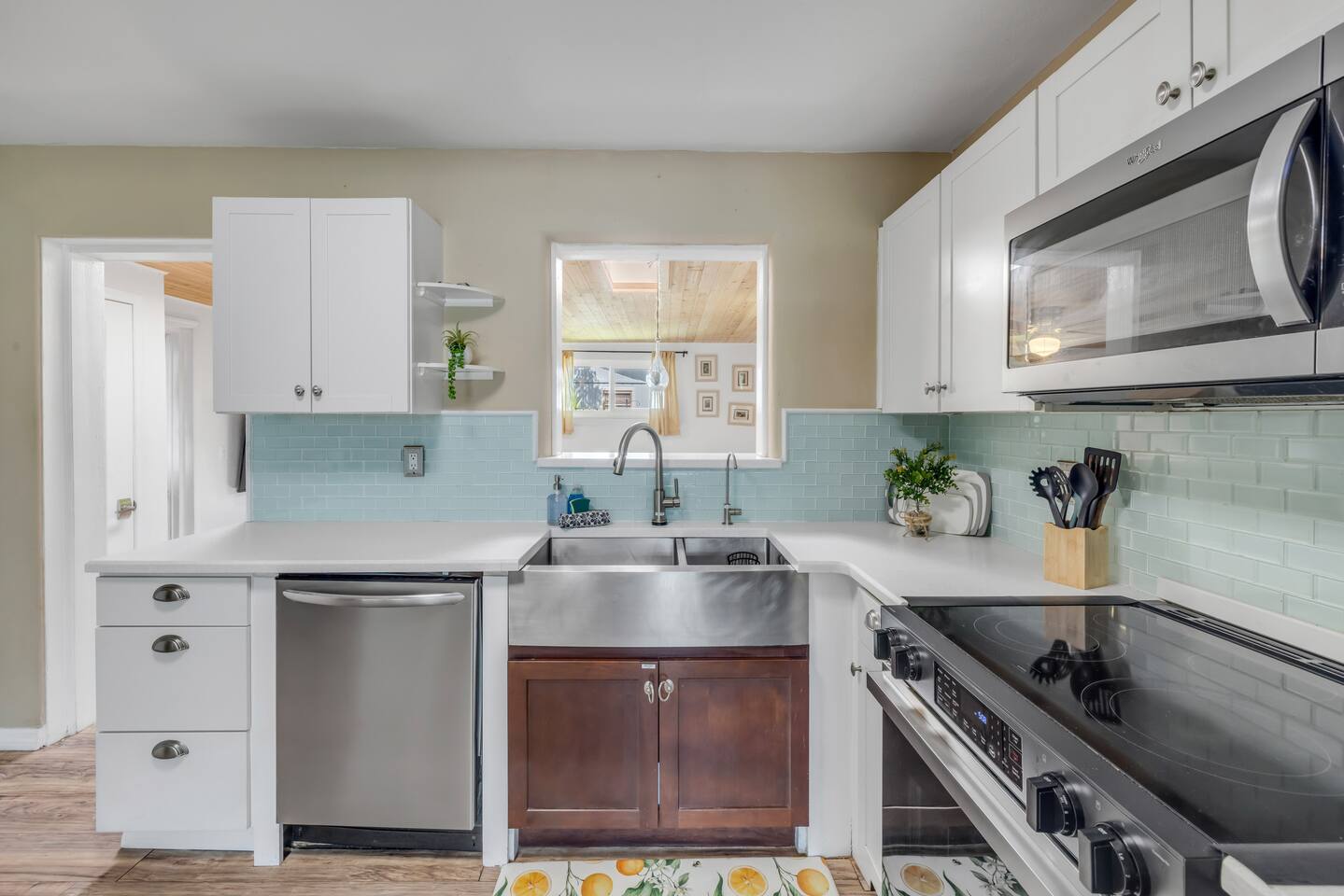 Welcome to your home away from home! This charming retreat is designed for comfort and convenience, offering everything you need for a relaxing stay. Located just 10 minutes from the beach and close to the vibrant dining, shopping, and nightlife of Flagler Avenue and Canal Street, you’ll be right in the heart of it all. Inside, the home sleeps six guests comfortably with three bedrooms and two bathrooms. The primary bedroom features a king bed, another offers two twin beds, and the third includes a pull-out couch along with a private office space—perfect for remote work or a quiet reading nook. The fully equipped kitchen comes with updated stainless steel appliances, while the bright, open living areas are filled with natural light, creating a warm and welcoming atmosphere. Step outside to your own private fenced backyard, complete with lush astro turf, plenty of room to relax or play, and an outdoor shower to rinse off after a day on the water or at the beach. Boaters will love the secure backyard parking, just one block from the Indian River Lagoon. With its comfortable layout, great amenities, and unbeatable location, this home is the perfect spot for families, groups, or anyone looking to experience the best of New Smyrna Beach.