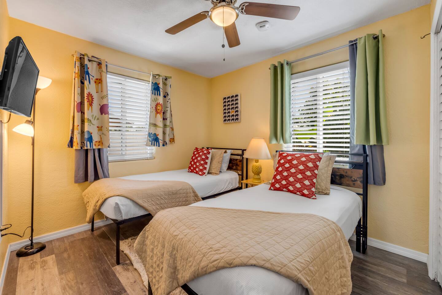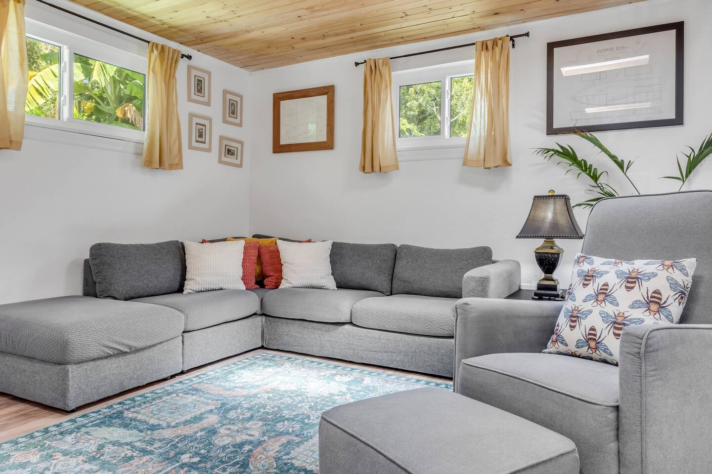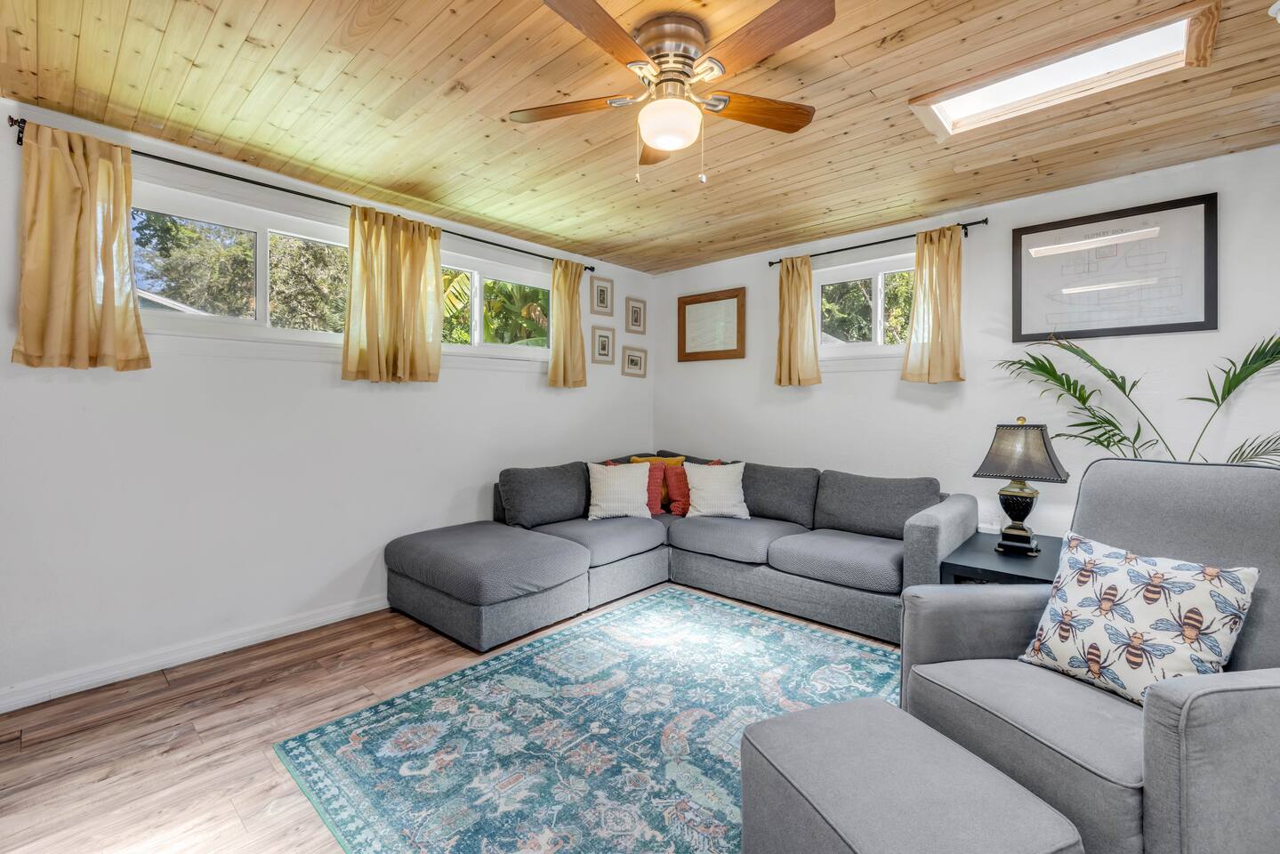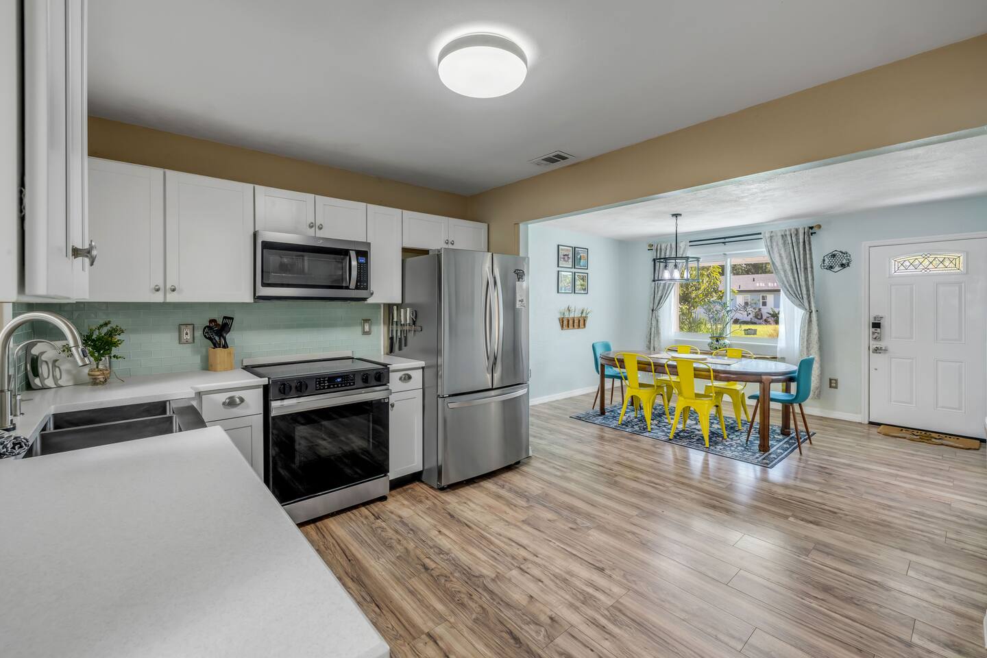 Welcome to your home away from home! This charming retreat is designed for comfort and convenience, offering everything you need for a relaxing stay. Located just 10 minutes from the beach and close to the vibrant dining, shopping, and nightlife of Flagler Avenue and Canal Street, you’ll be right in the heart of it all. Inside, the home sleeps six guests comfortably with three bedrooms and two bathrooms. The primary bedroom features a king bed, another offers two twin beds, and the third includes a pull-out couch along with a private office space—perfect for remote work or a quiet reading nook. The fully equipped kitchen comes with updated stainless steel appliances, while the bright, open living areas are filled with natural light, creating a warm and welcoming atmosphere. Step outside to your own private fenced backyard, complete with lush astro turf, plenty of room to relax or play, and an outdoor shower to rinse off after a day on the water or at the beach. Boaters will love the secure backyard parking, just one block from the Indian River Lagoon. With its comfortable layout, great amenities, and unbeatable location, this home is the perfect spot for families, groups, or anyone looking to experience the best of New Smyrna Beach.